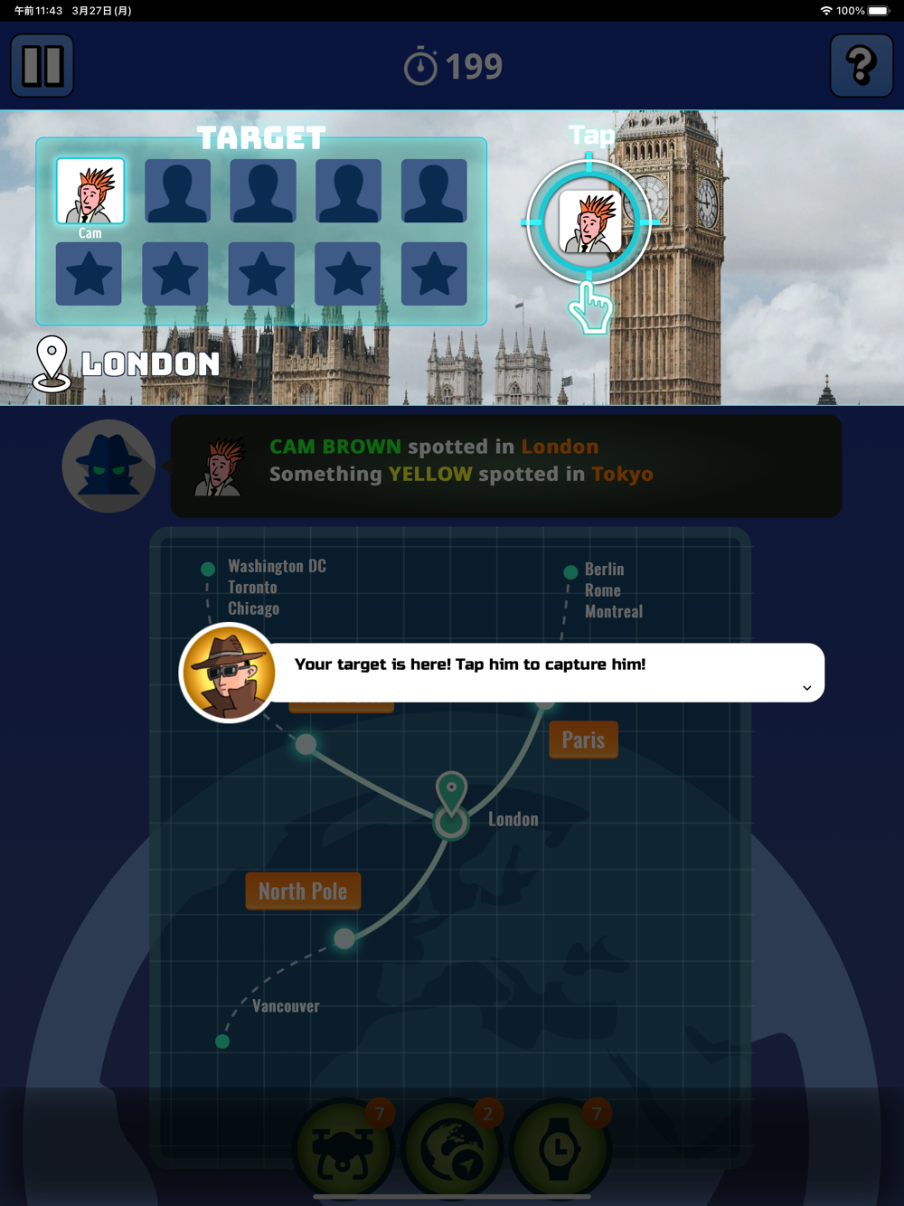 Your targets are indicated at the top of the screen. Tap the name of a city on the map to move there, and if you find your target spy or item there, tap on the target to capture it.