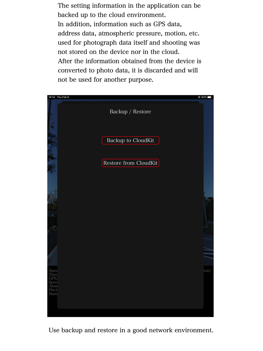 - Since GPS data and atmospheric pressure data are recorded as photo data, they cannot be updated later for correction after taking a photo.