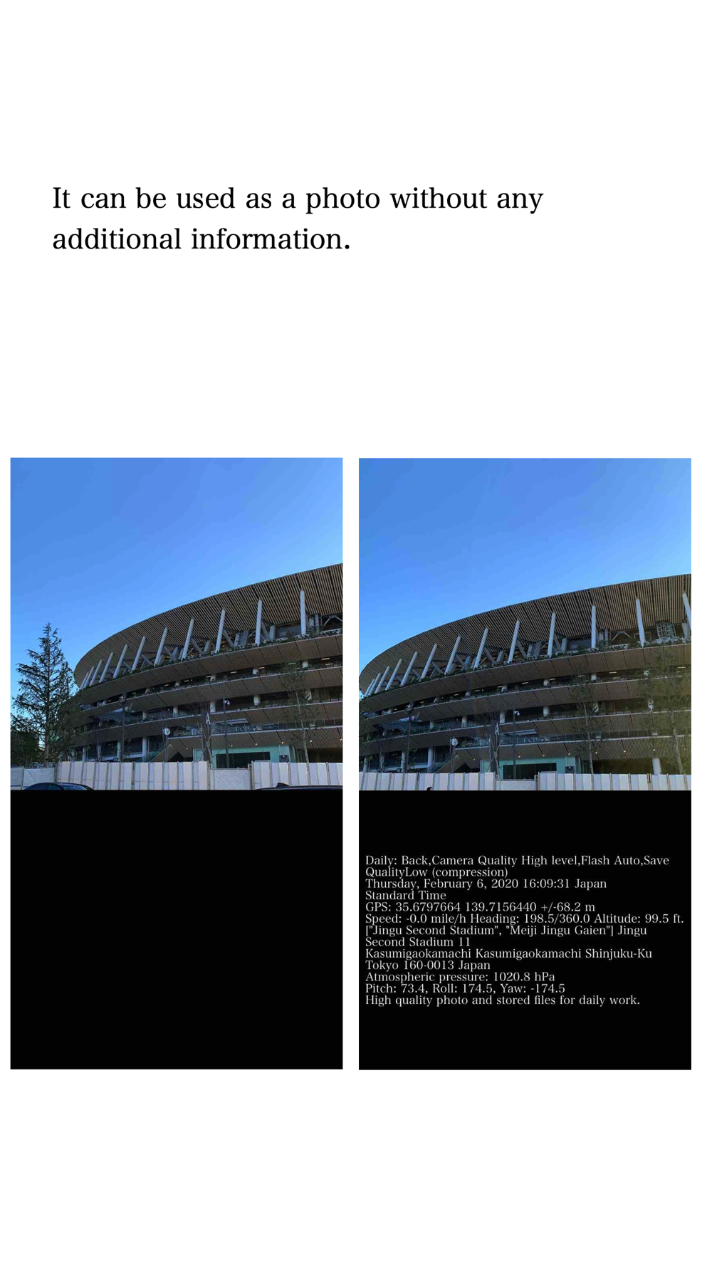 1. An app that can record date and time, GPS, shooting address, direction, altitude, pressure, and moment along with photos
