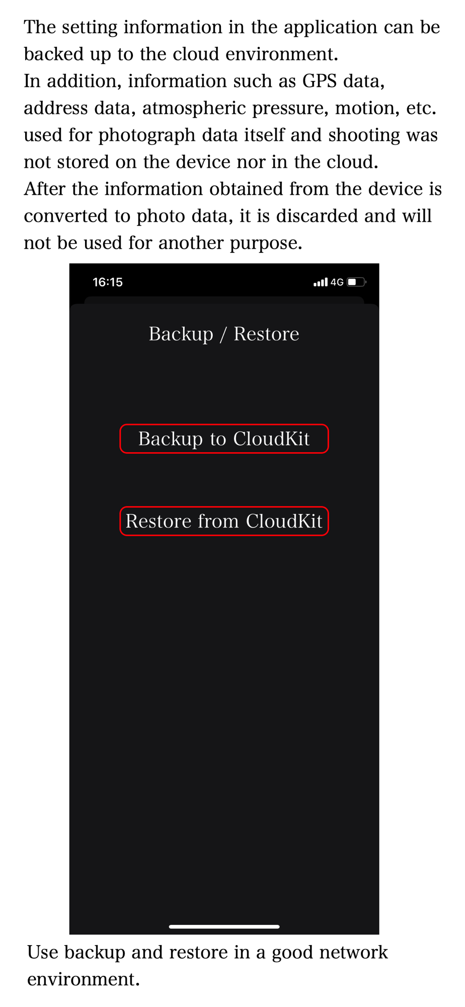 - This app stores photo data in the device's standard photo library. Only setting information is stored in the app itself and the cloud environment.
