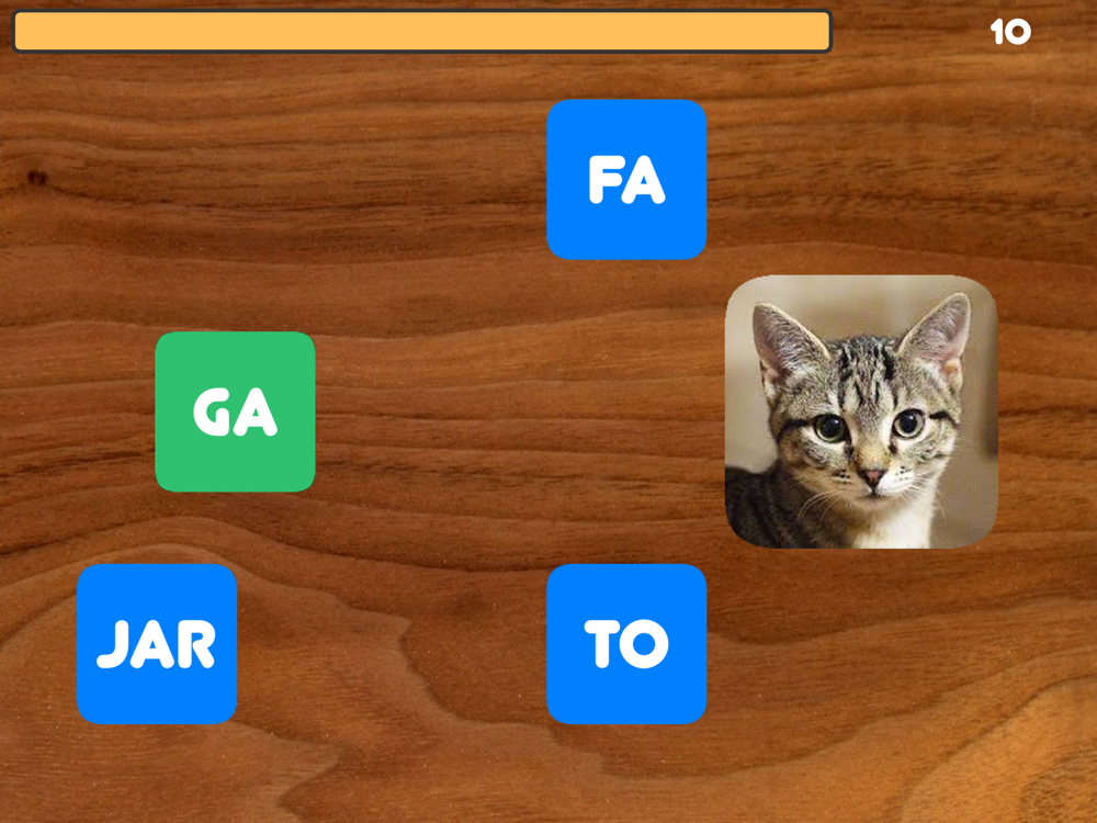 Um jogo para aprender a escrever com silabas portuguesas. Escolha as sílabas corretas para compor a palavra que lhe é apresentada! Quando você completa uma palavra, o jogo começa de novo com uma nova palavra. Tantas palavras diferentes para jogar e aprender, todas compostas por duas sílabas.