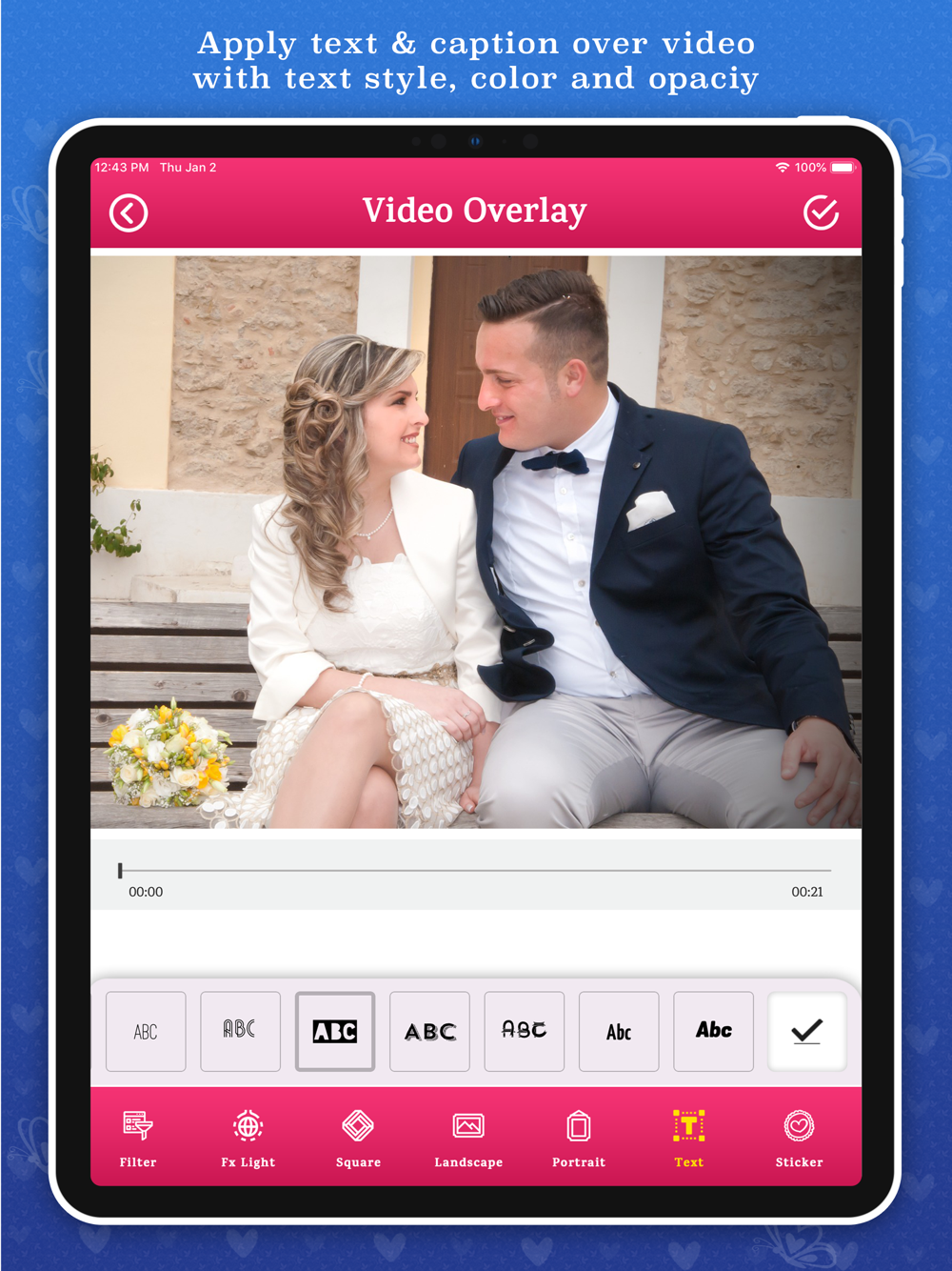Love Video Maker also provide romantic and love music and also you can pick music from iTune library, get music from video and record voice for your video and also advance trimming function and latest overlay collections.