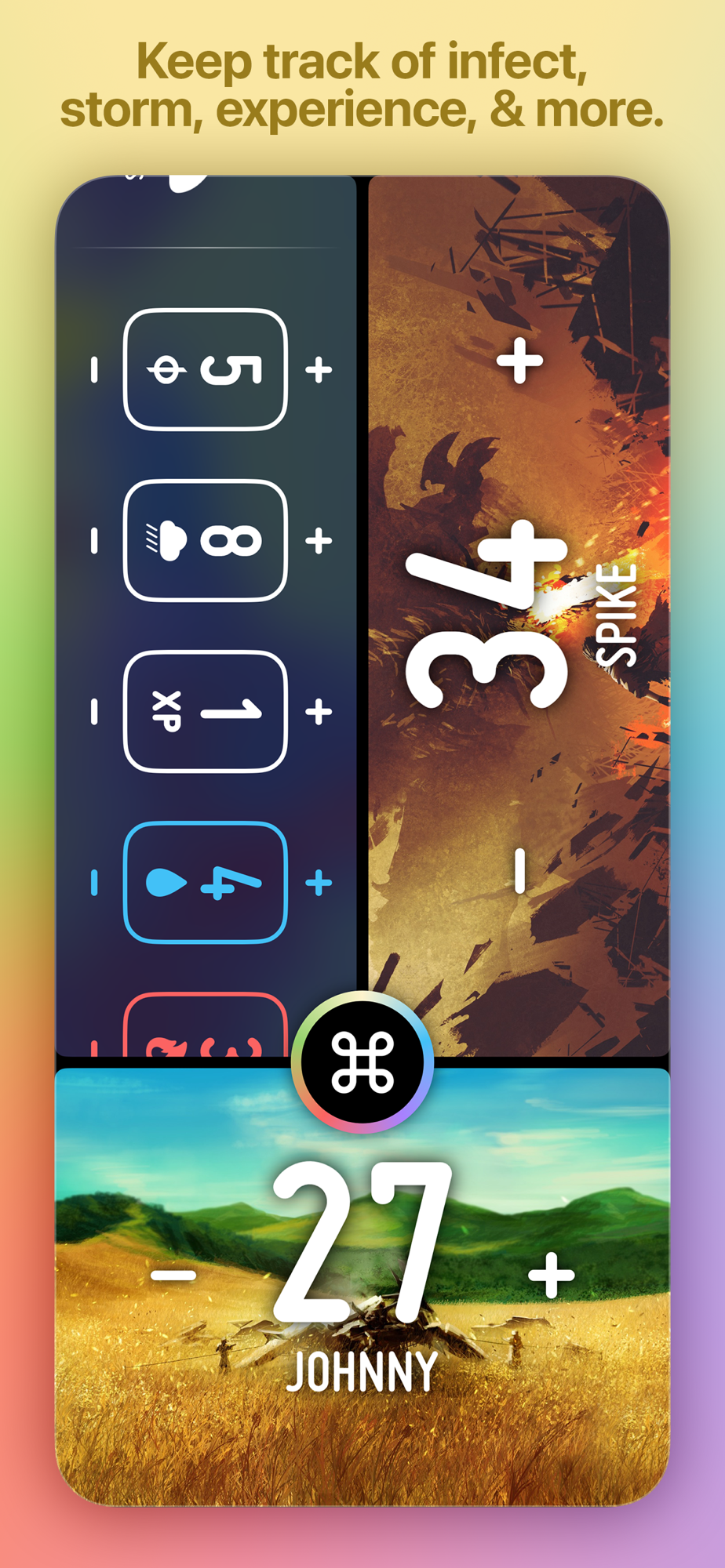 • Keep track of in-game numbers like commander tax, infect, storm, experience, energy, mana pools, and more using the player options menu (swipe down on your player to see these options).