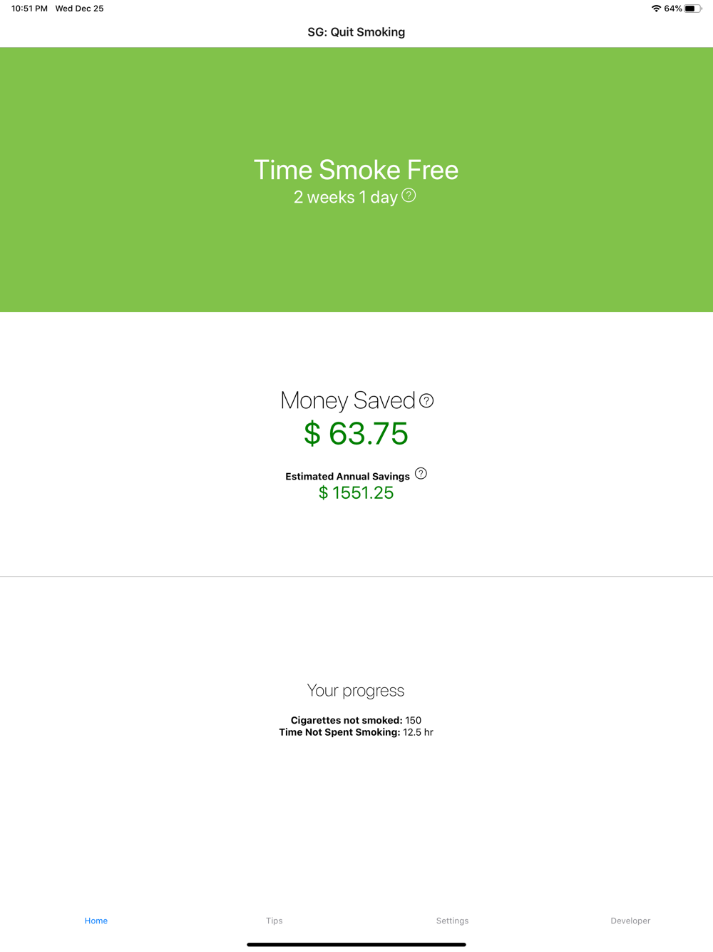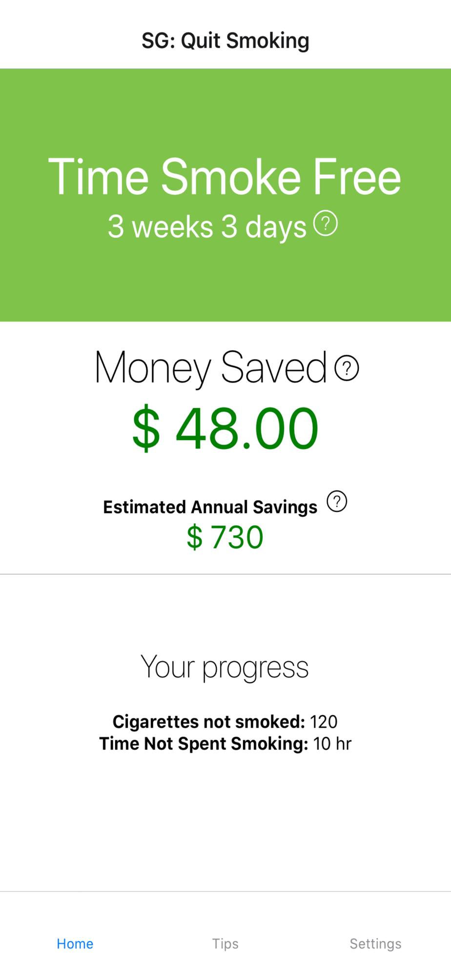 To get started, just fill a quick questionary and that's it. You are all set. Our app will allow you to track your progress on daily basis, monitor the amount of money saved from the day 1 of quitting as well as estimate for the year.