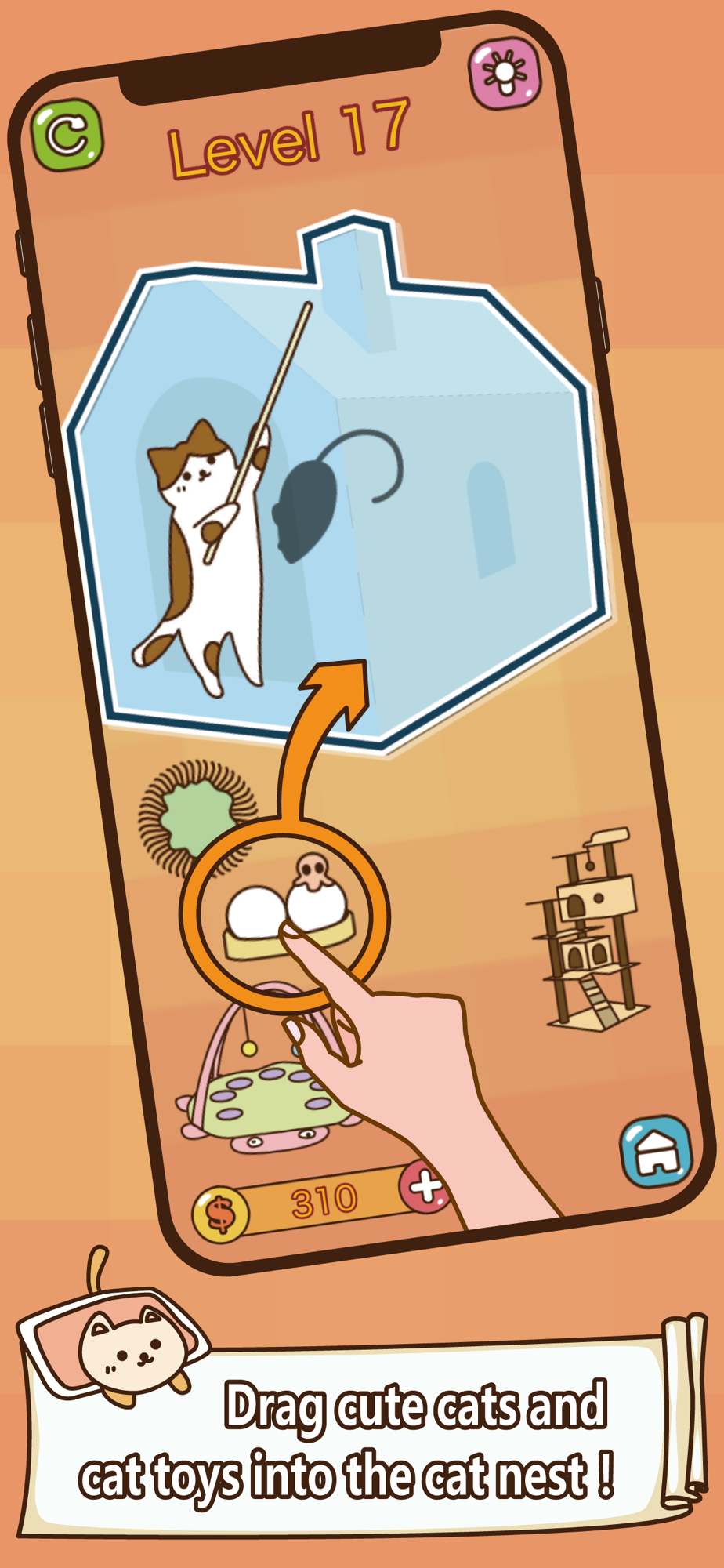 If you like cats and play pack master,1010, jigsaw puzzles and tangram puzzles and casual puzzles that require spatial induction and spatial analysis, or if you are looking for an interesting time killer game to pass the time, don't hesitate to play this super fun leisure puzzle game with the theme of cute cats,: Help Cats Into The Cat Nest, which allows you to relax your brain and exercise your brainpower. It can also challenge and train the ability of intellectual space arrangement and induction.