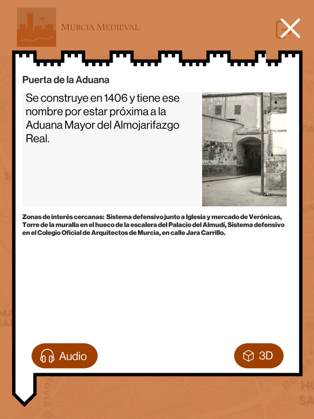 La aplicación te permite conocer el trazado de la Muralla Medieval y la situación de sus 16 puertas. En cada una de ellas podrás escuchar una breve descripción por parte de diferentes personajes históricos y consultar cuales son los lugares de interés arqueológico cercanos relacionados con la antigua cerca defensiva.