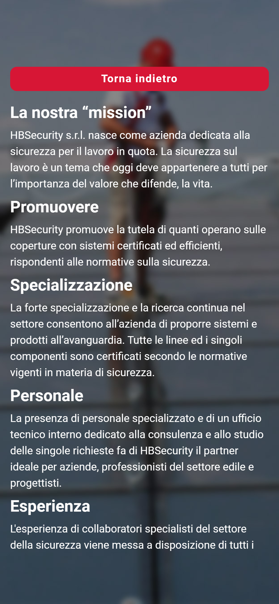 HBSecurity s.r.l. nasce come azienda dedicata alla sicurezza per il lavoro in quota. La sicurezza sul lavoro è un tema che oggi deve appartenere a tutti per l’importanza del valore che difende, la vita.