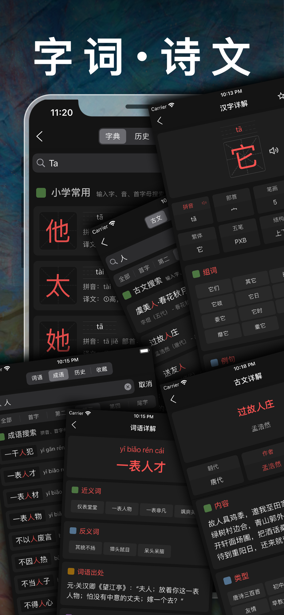3、汉语字典、拼音、笔画、边旁部首搜索功能;