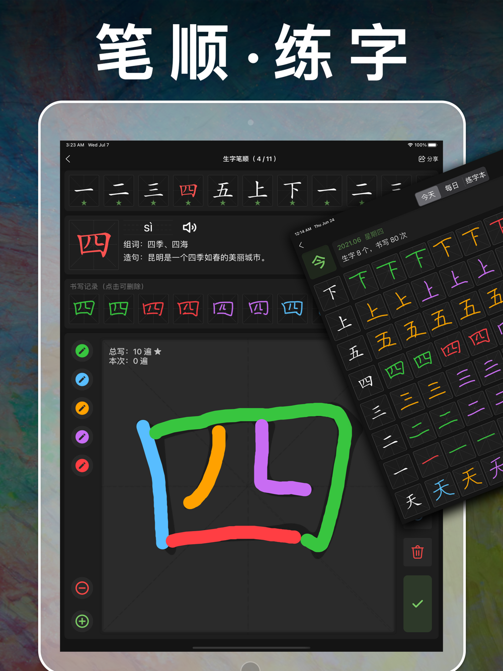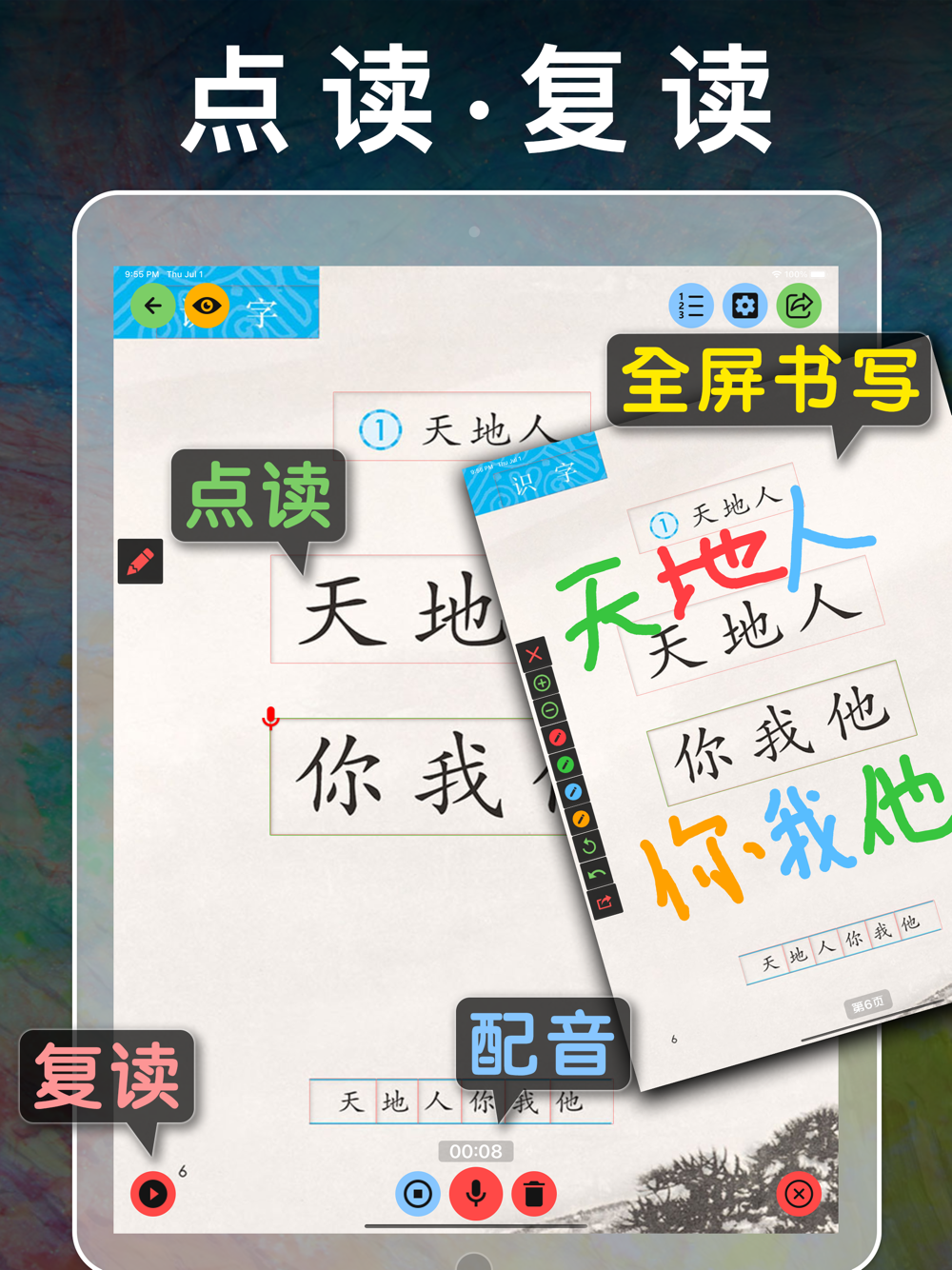 生字训练:手写板,拼音练习、笔顺笔画书写