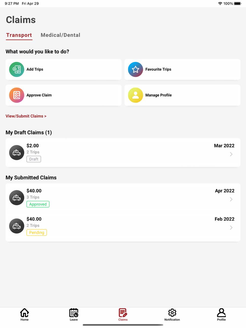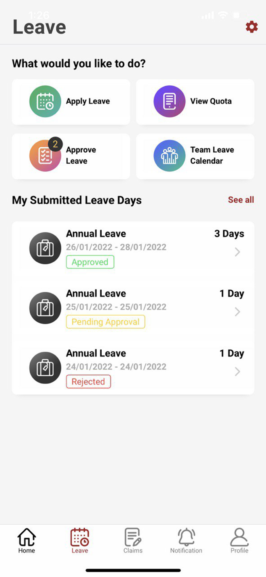 The application provides users the convenient access to manage their claims and reimbursements such as leave, transport and medical bills on-the-go and receive notifications anytime, anywhere.