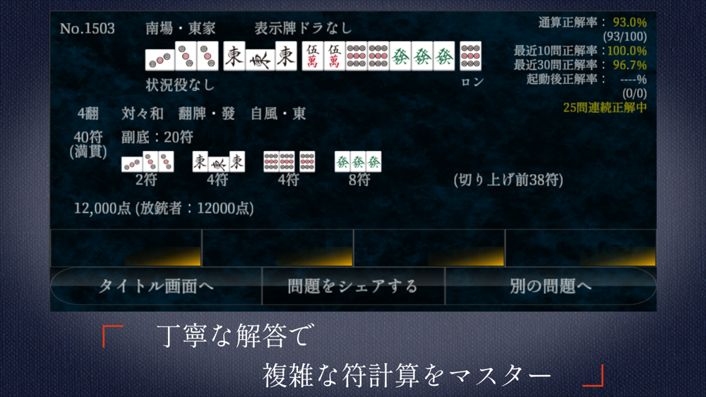 すべて実戦の麻雀で現れたアガリ形から採用しておりますので、他のアプリにはない実践的な練習ができるものと自負しております。