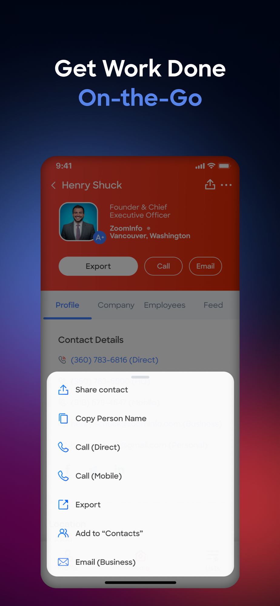 Find decision makers’ direct numbers, share them with colleagues, and start calling, right from your mobile device.
