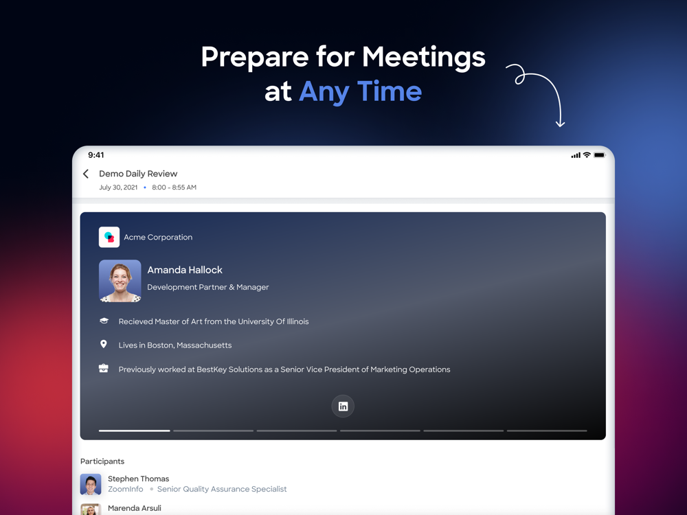 Turn meetings into wins. Review pre-meeting briefs on the fly-from learning more just-added stakeholders to sharing icebreaker questions and building last-minute talking points based on key insights.