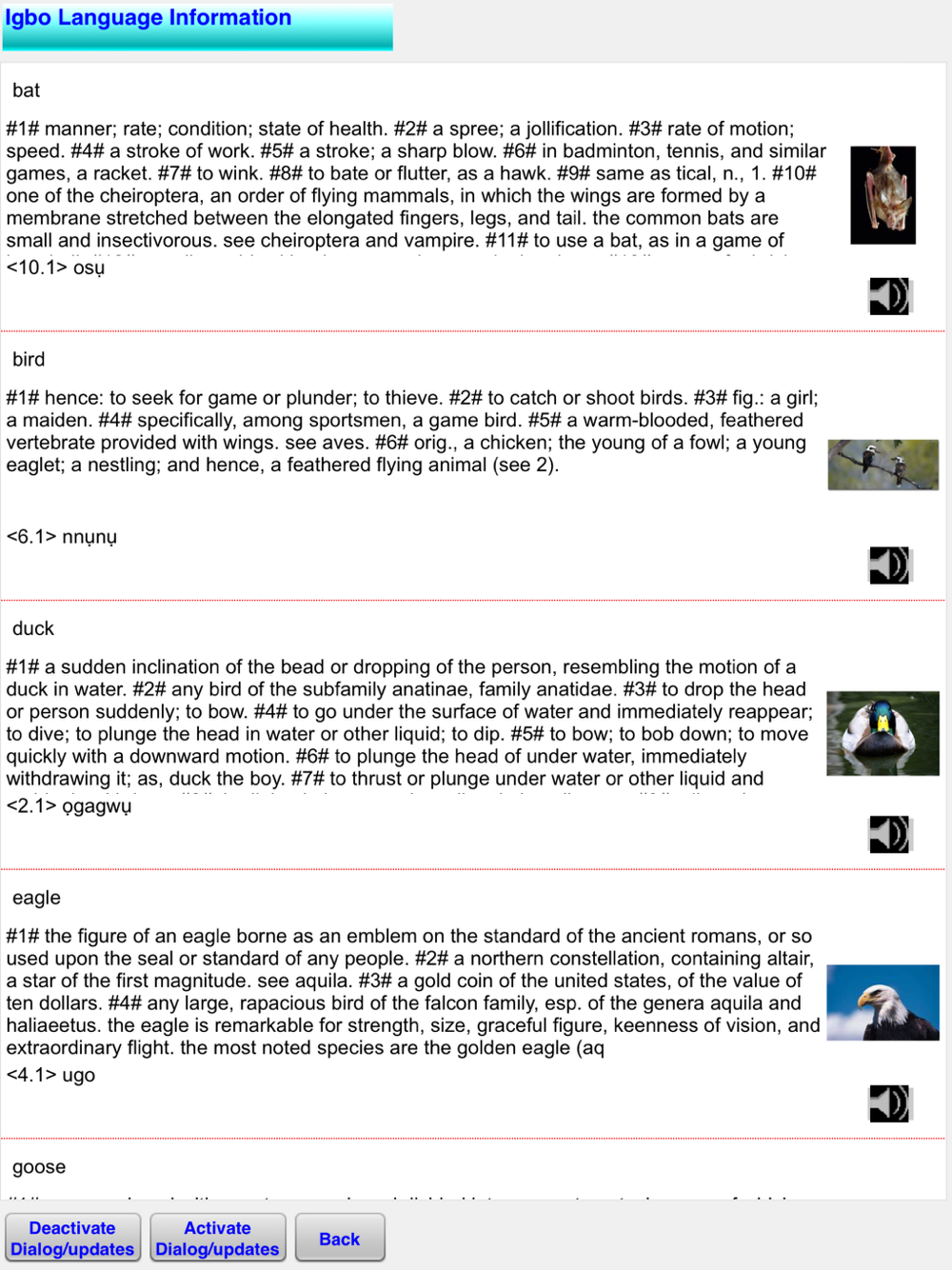 The professional version enables users to update the translated data if they are using it to teach others as there are many ways to speak a language. It also enable users to create new data translations, record and play back or delete audio Igbo data, record and play back or delete dialog audio Igbo data.