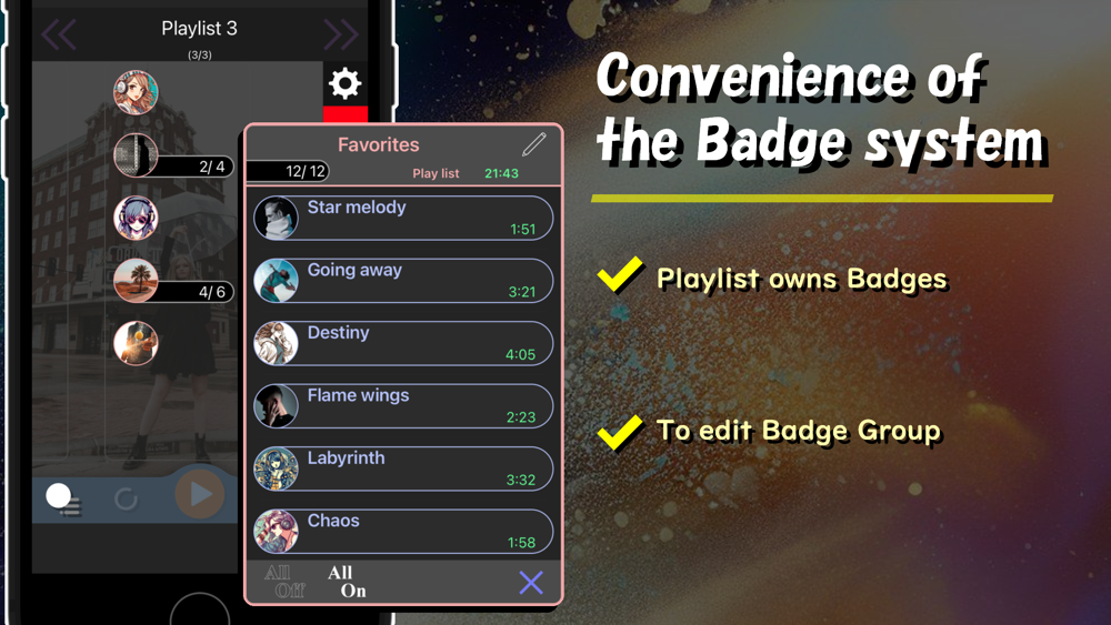 This app uses a system called "Badge system", which allows you to easily manage and operate Songs of Playlist(called Badges) on the app with one tap/drag and drop.