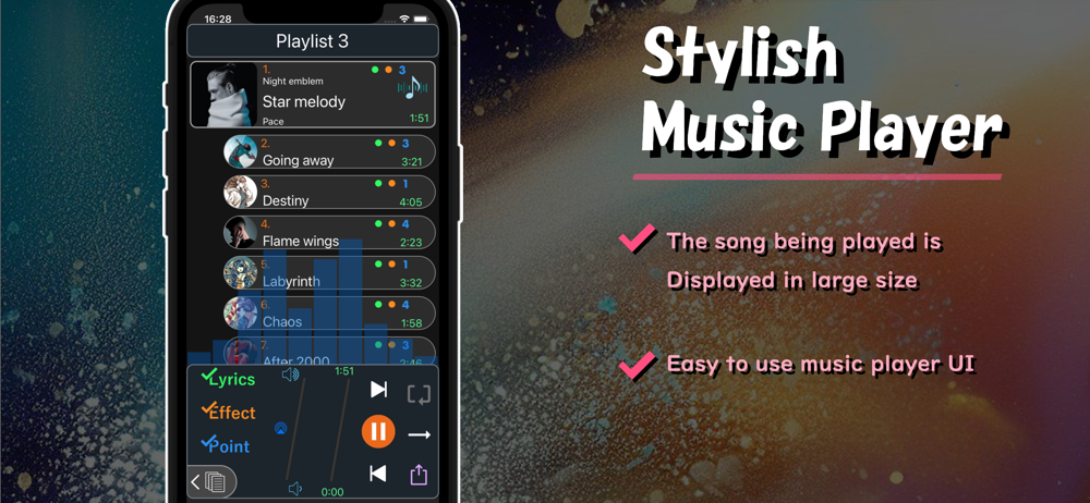 You can use easy-to-understand basic operation buttons, specify the audio output destination using AirPlay, manage lyrics, effects, and point functions.