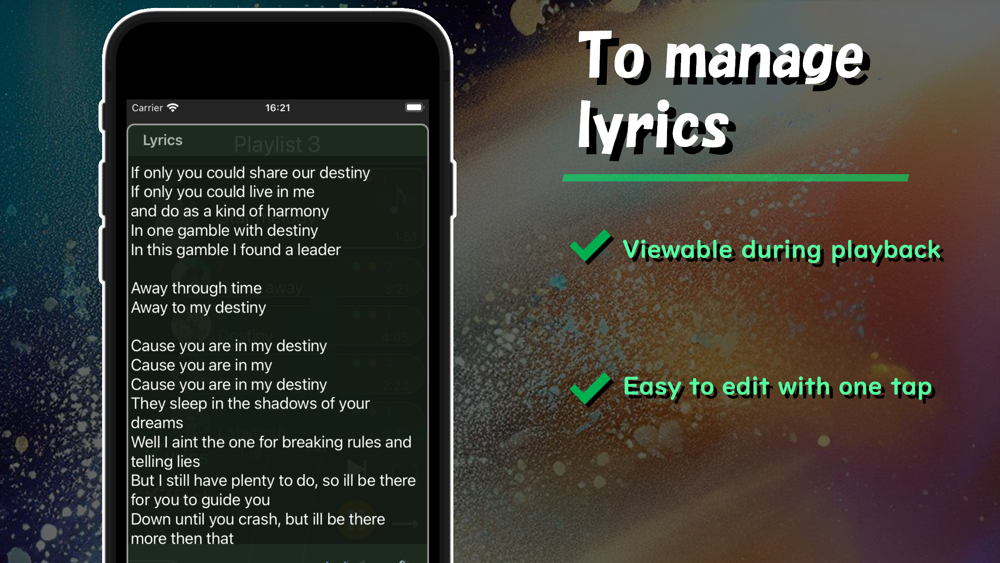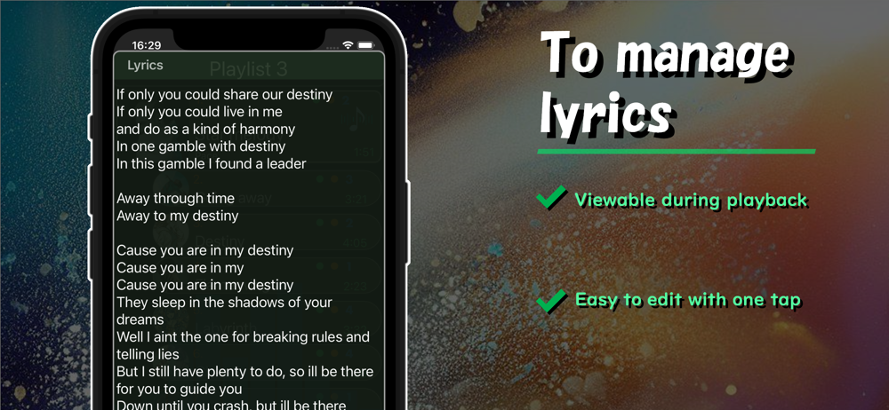 Lyrics registered from Music or iTunes are automatically read, and you can see and edit it with one tap.