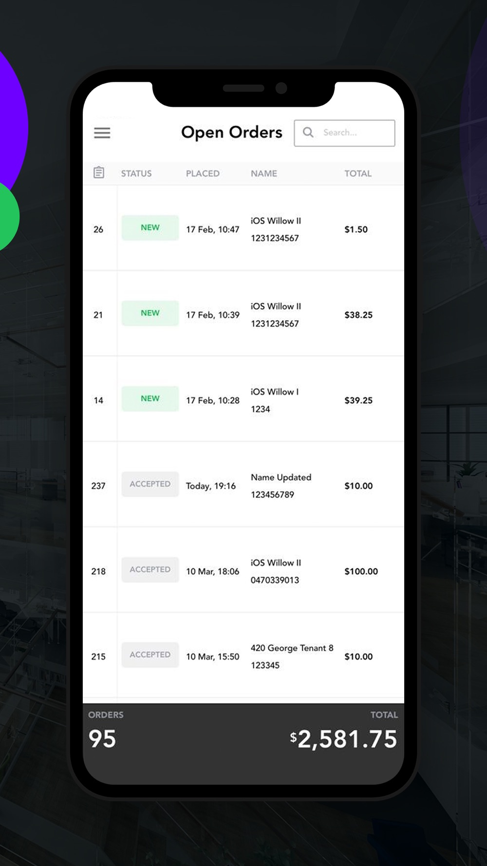 The Willow Merchant App provides Cafes and Restaurants access to the Willow platform. It is an intricately designed user interface that allows access and processing of orders coming from the Willow Experience App.