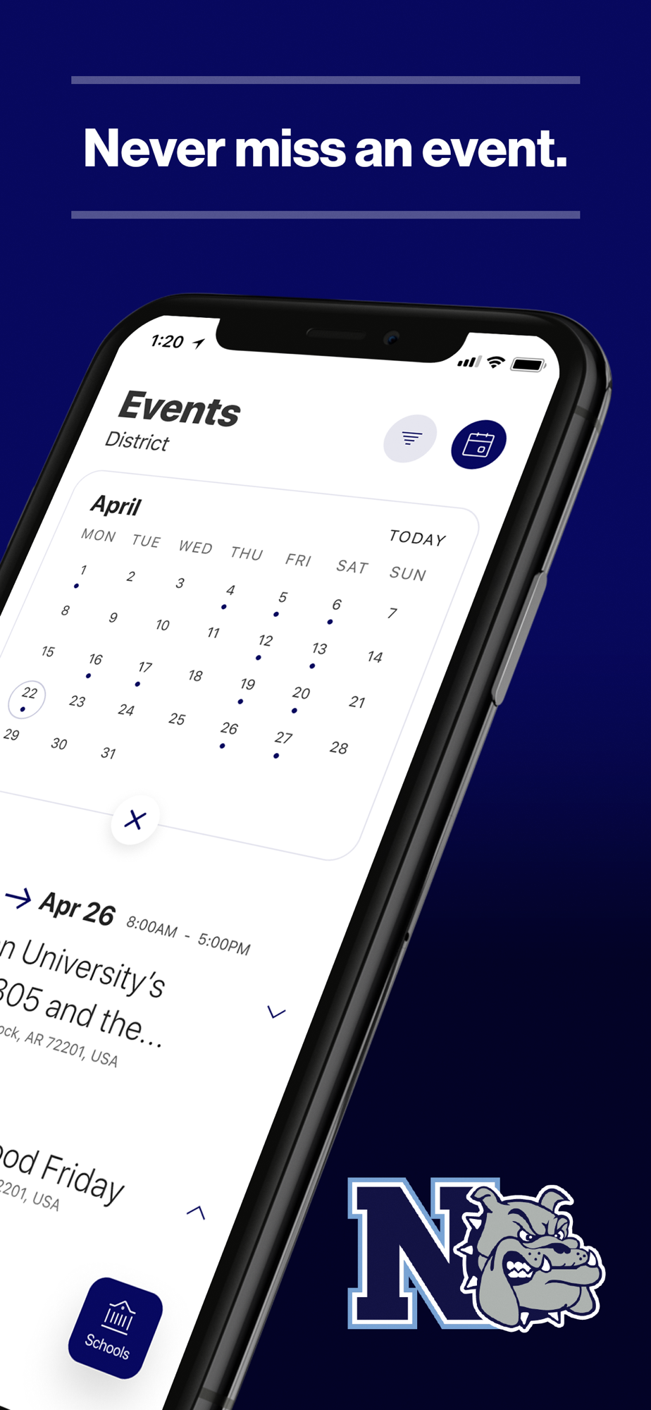The event section shows a list of events throughout the district. Users can add an event to your calendar to share the event with friends and family with one tap.