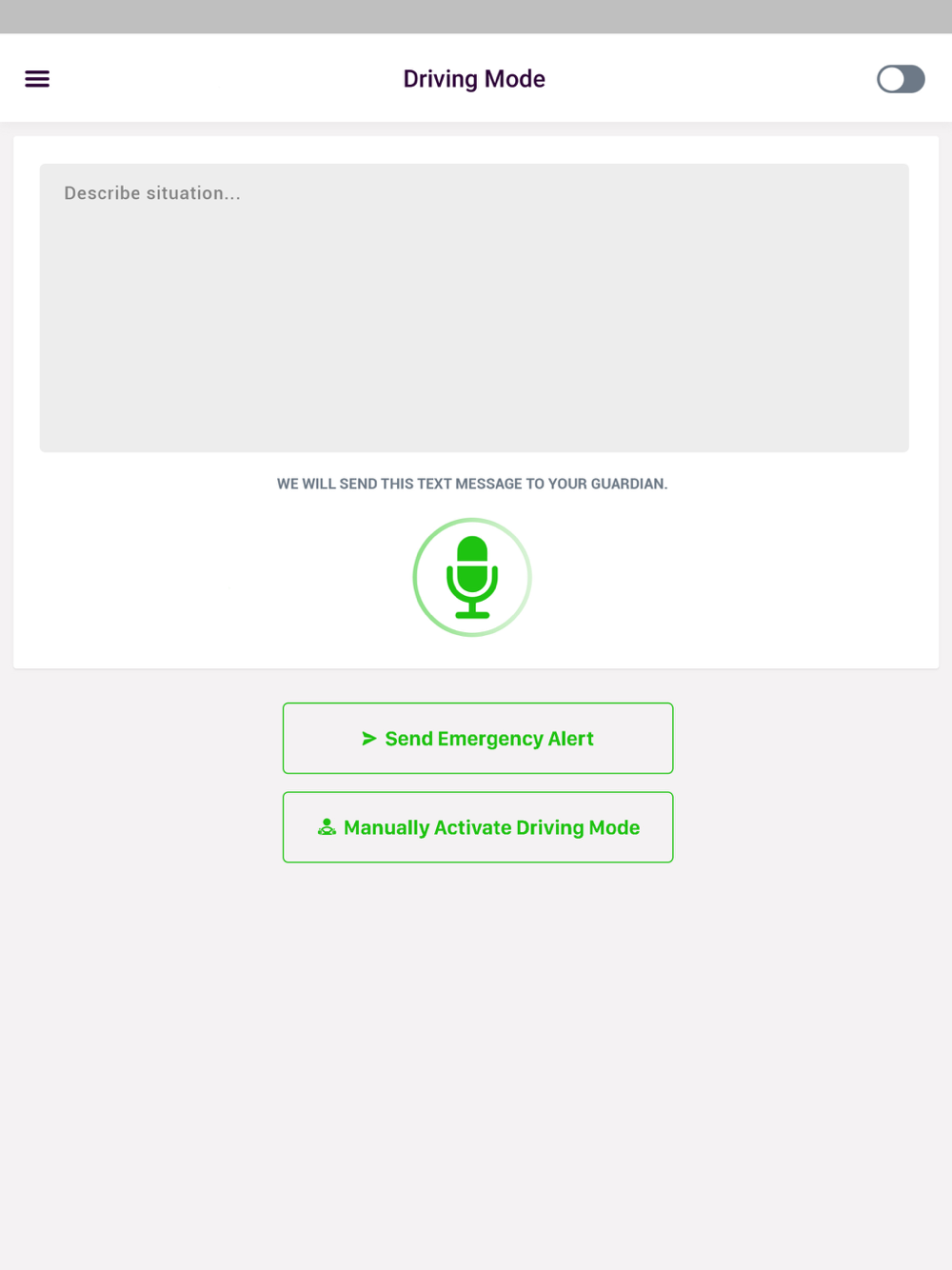 While keeping dependents safe , the app also provides parents and guardians a view of stats and number of times the user exceeded the set speed. The app also has a voice record feature that can be sent to guardians in times of need and emergecies.