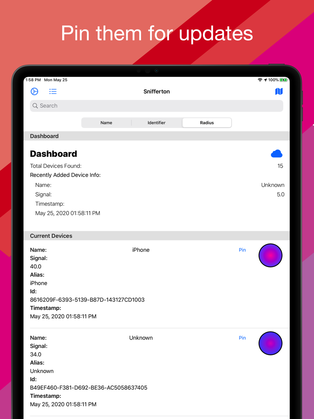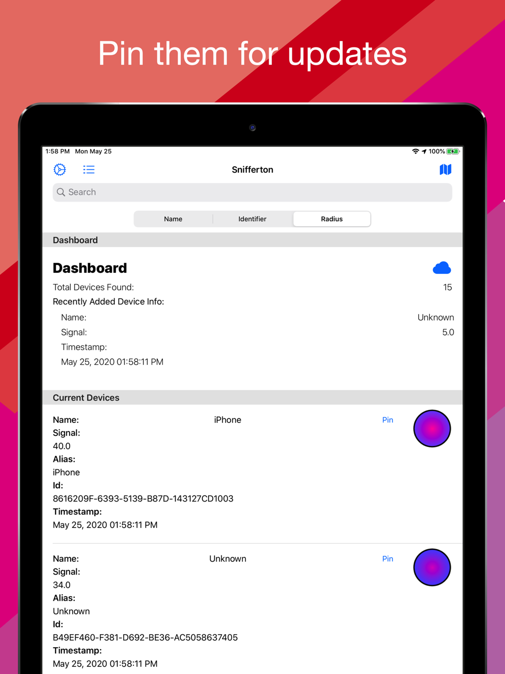 Snifferton Cloud allows you to create your own network to keep track of devices even when you are not home. Just pin a bluetooth device using an iPod touch, iPad, or other iOS device, leave it at home and you can check up on it remotely using your smart phone only through Snifferton Cloud.