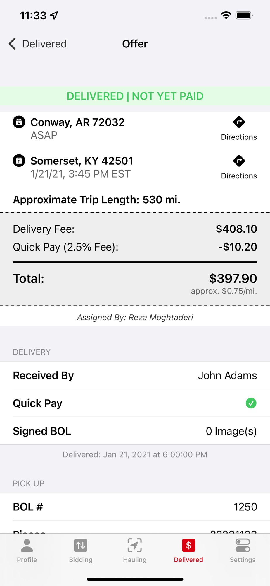 After you're approved and authorized, the dispatch will send you the best loads available in your vicinity and you'll be able to make a bid, accept or reject it!