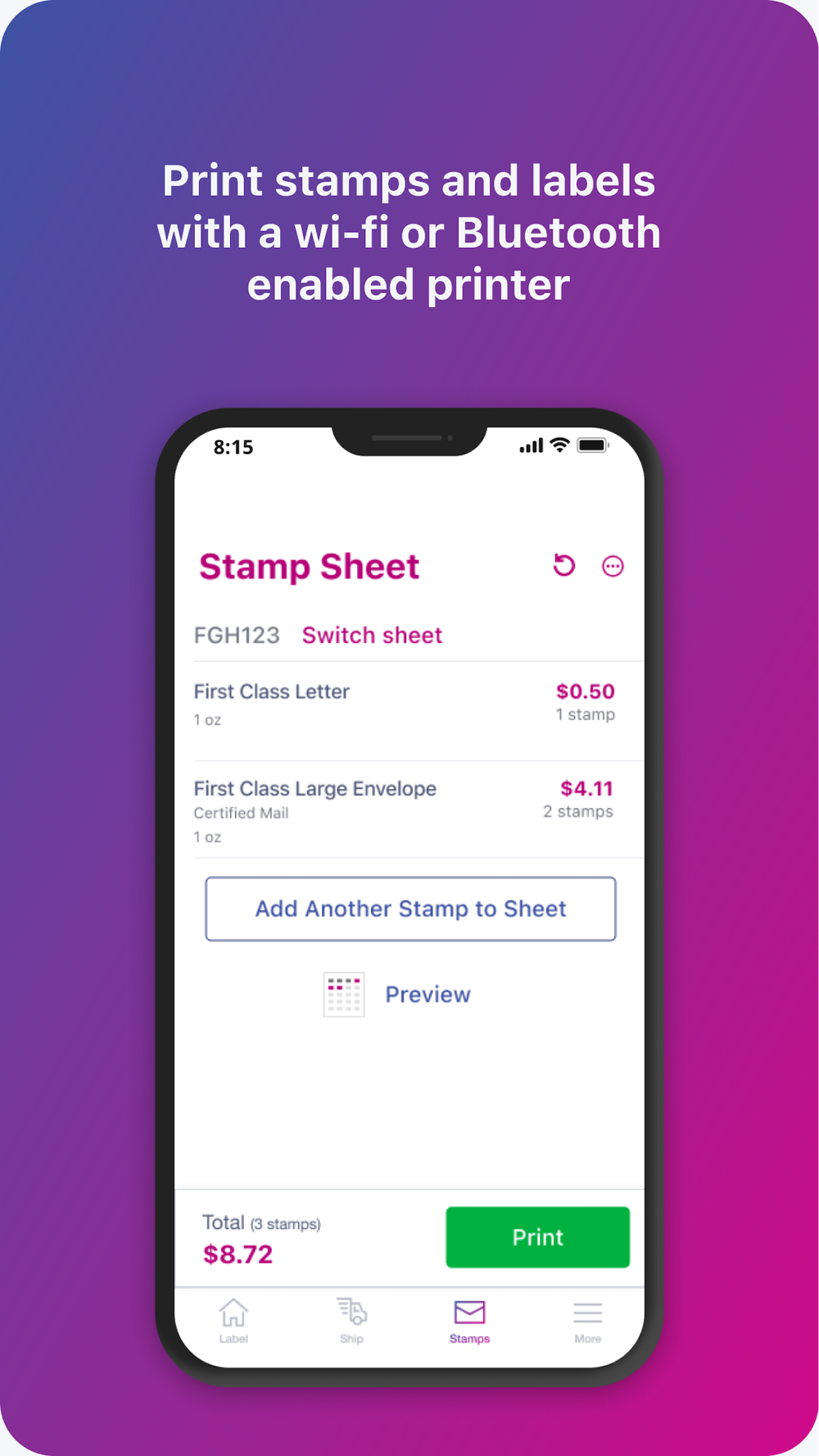 o Print discounted postage stamps on stamp sheets