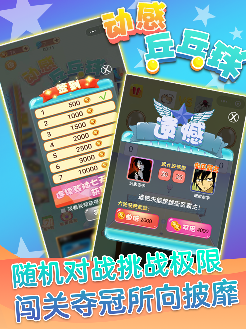 多种游戏模式选择:闯关夺冠、在线对战、街区争霸三种,让玩家自由选择喜欢的模式进行乒乓球对决。