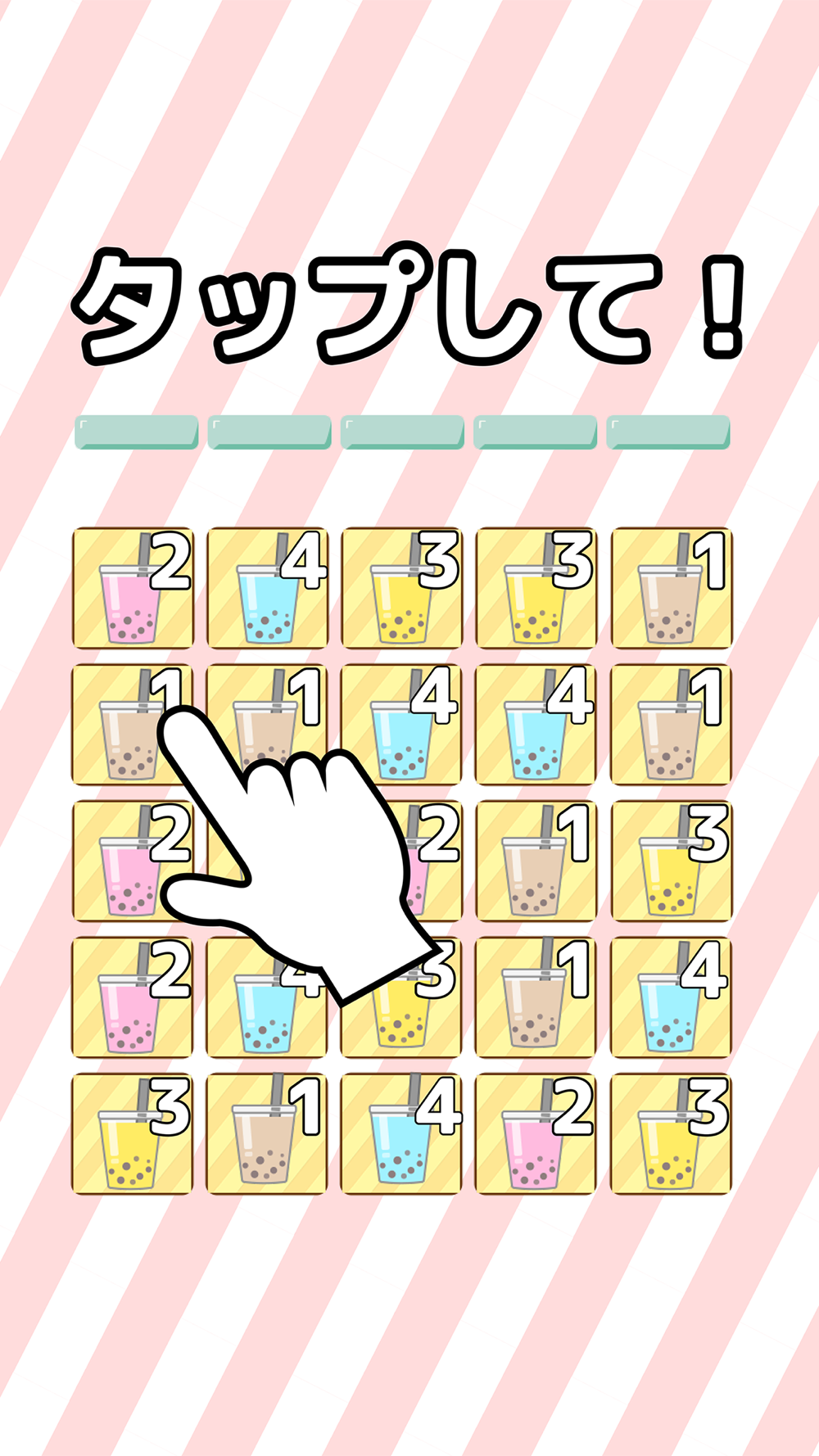 タピオカをクリックすると数が上昇して、同じ数が上下左右に3こ並べると