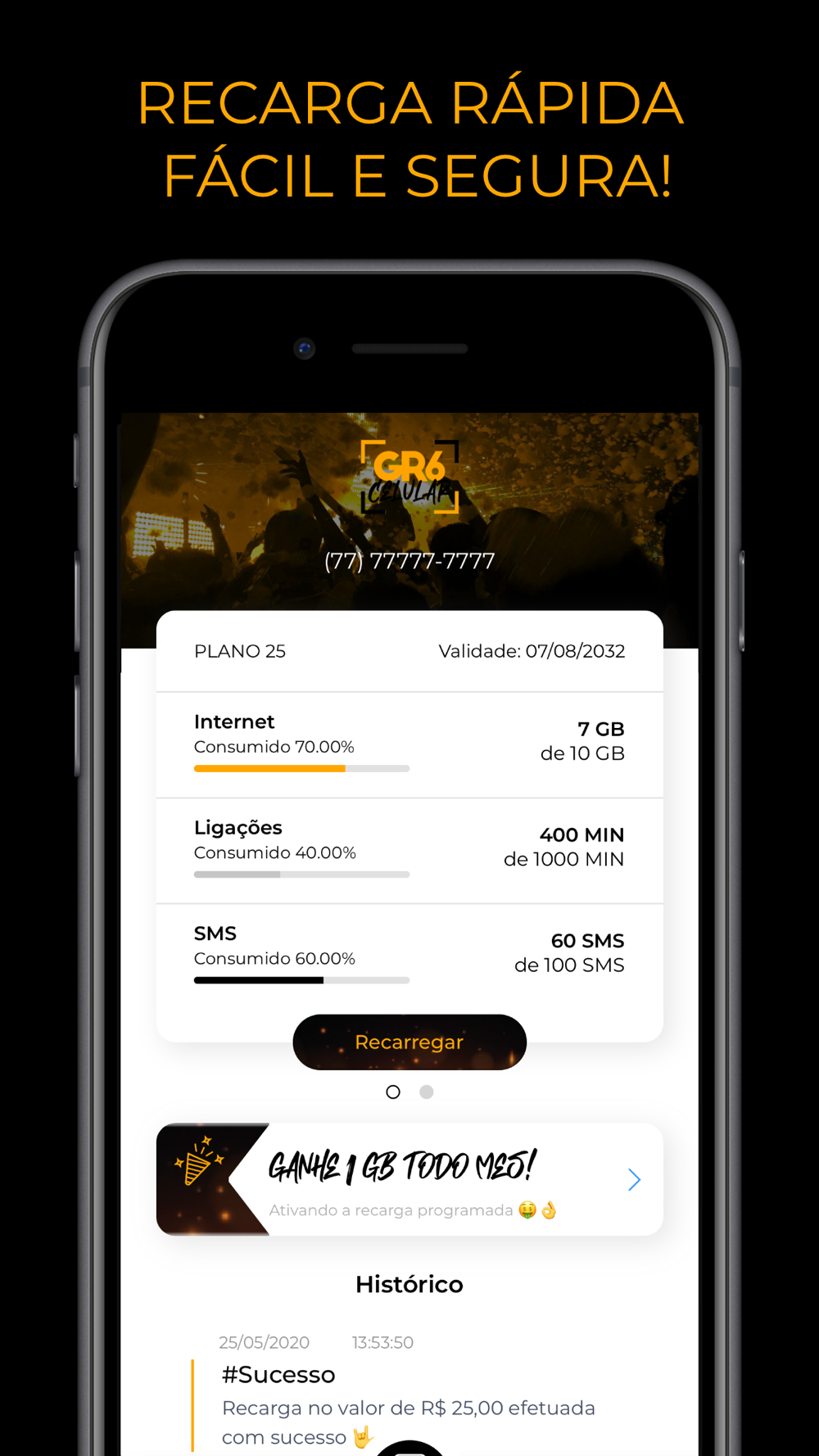 - Histórico das recargas realizadas online (aplicativo, site do GR6 Celular e por SMS).