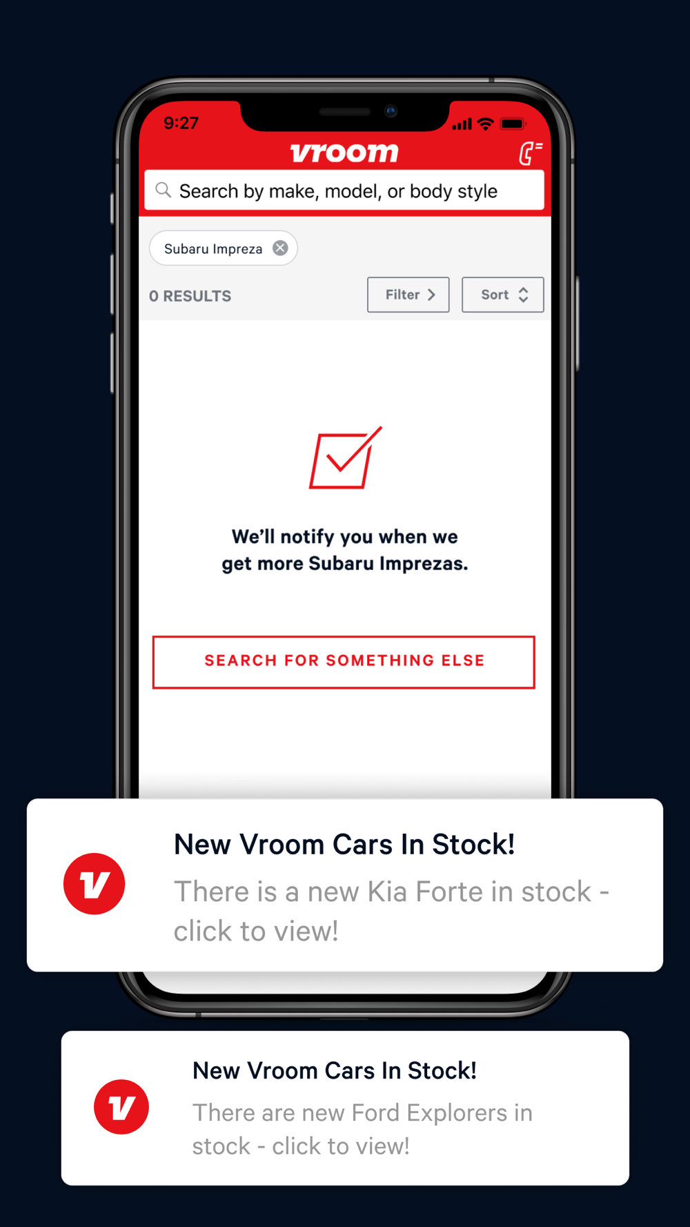 You've found us: a better way to buy a car! Use the Vroom app to find your next great car, and have it delivered to you - all without taking a trip to the dealership.