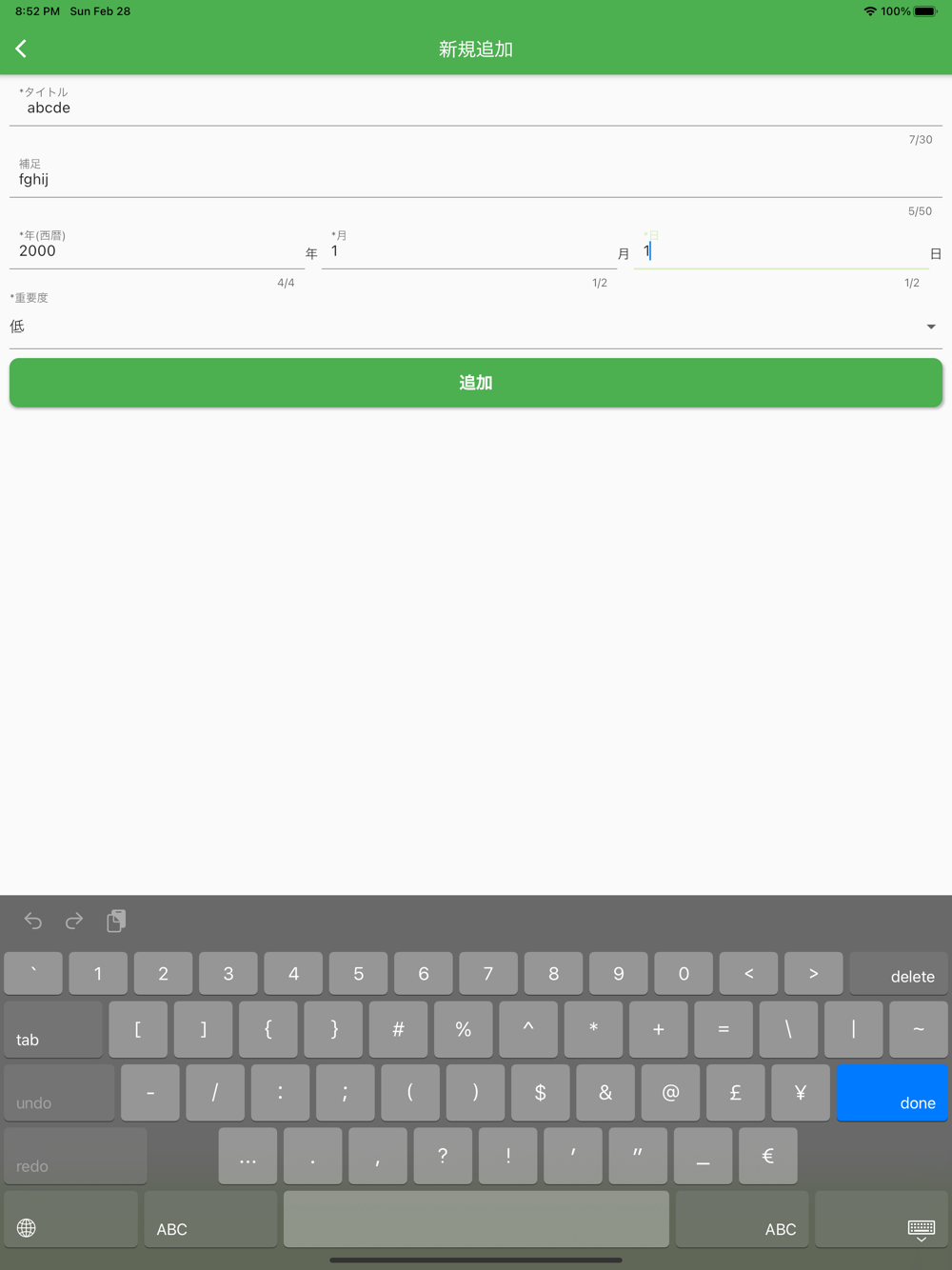 ・タイトル(必須)、日付(必須)、補足(任意)、重要度を入力します。