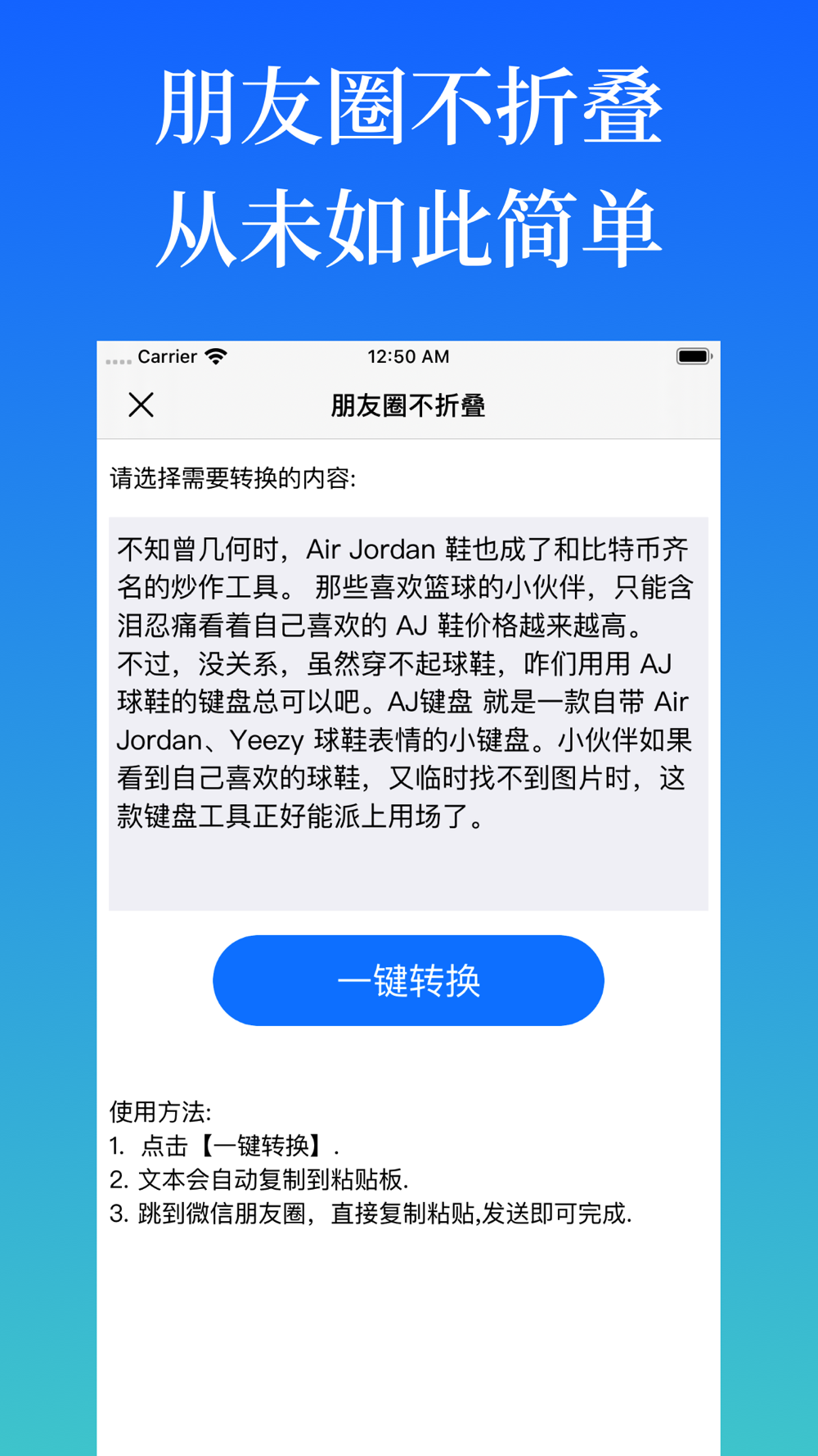 1. 超强朋友圈不折叠功能,无需键盘,转换后直接复制粘贴。