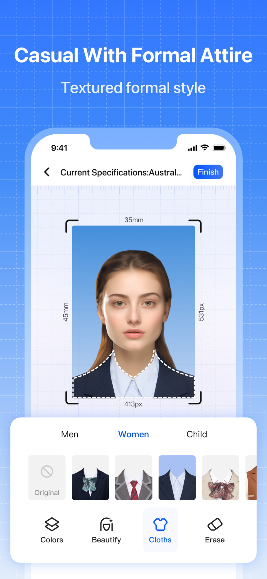 ◆Hundreds of ID photo specifications Not only supports customized ID photo sizes, but also provides more than 100 official ID photo specifications. For example: regular size photos such as one-inch and two-inch photos, various examination certificates for civil servants, doctors, teachers, accountants, driver's licenses, etc., social security, resume and other types of photo specifications.