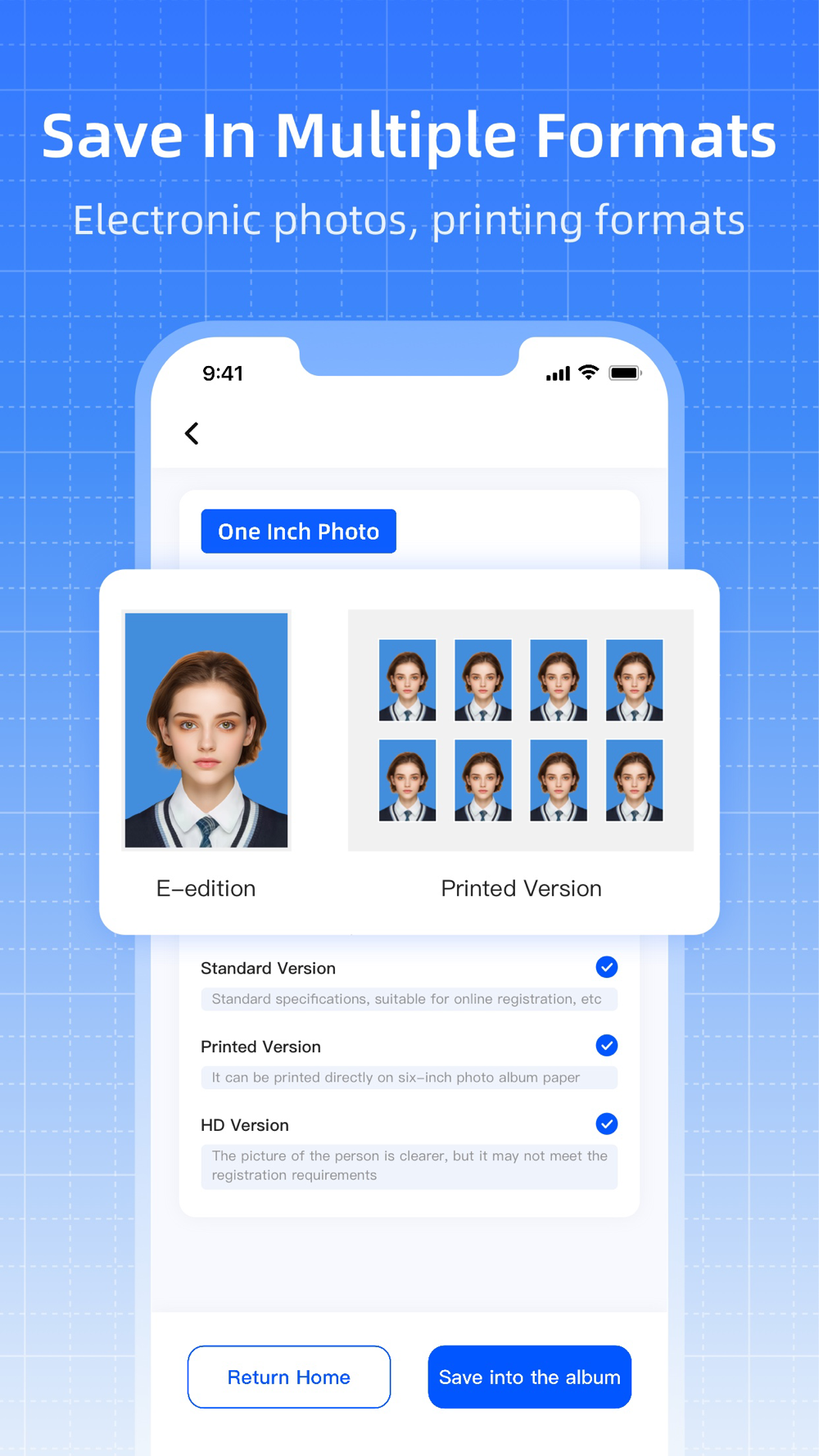 ◆Save in multiple formats. You can save the watermark-free version of the electronic ID photo in the photo album, and you can also directly save the photo in the printed version, which is convenient, fast, easy and professional.