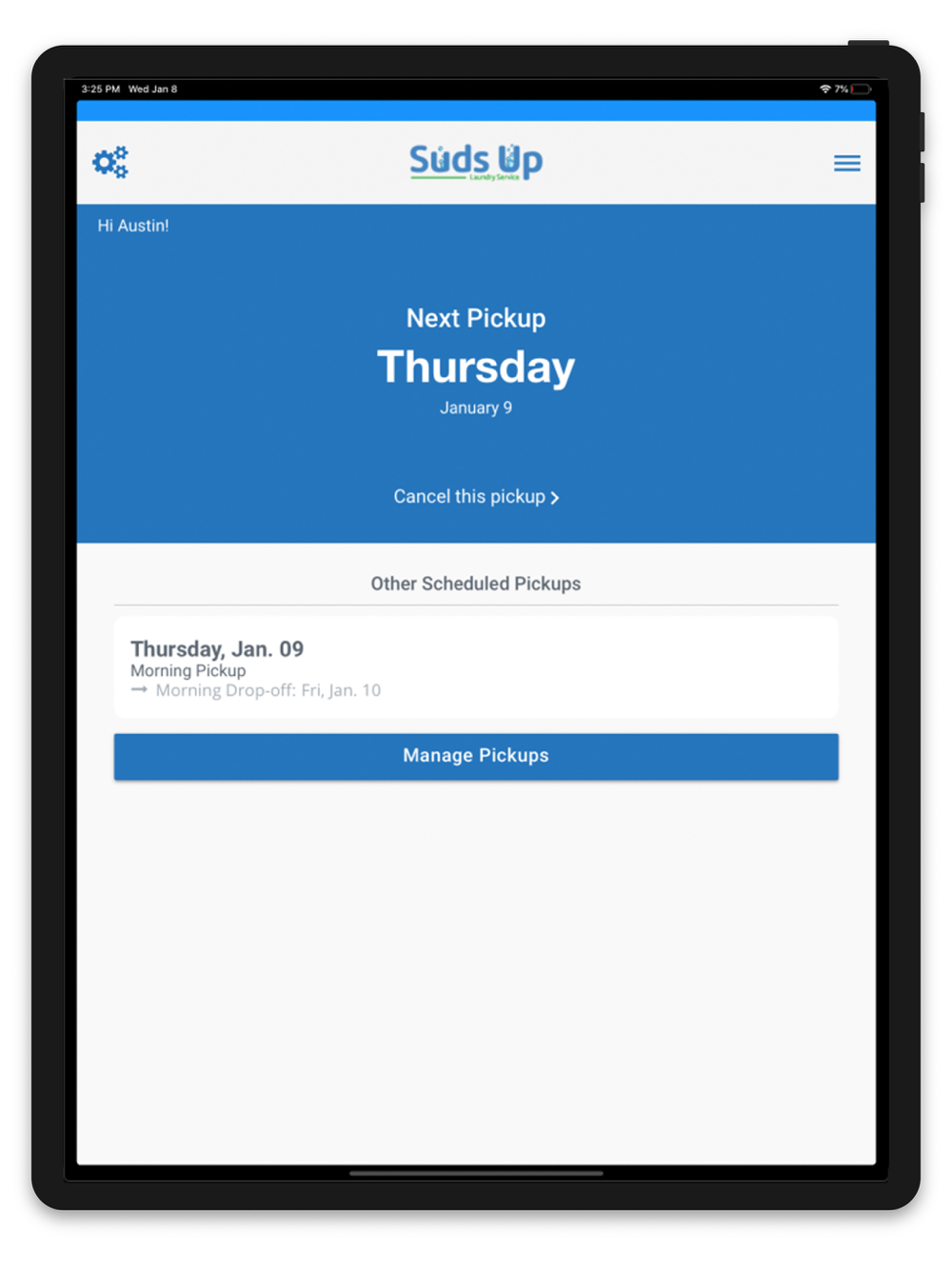 Suds Up Laundry offers the best, personal, next-day return, laundry service. Create an account, choose your plan type – weekly or “by request” – set up your laundry preferences (everything from which detergents, fabric softeners and dryer sheets you like to how you want your clothes folded), set up your first pickup and say “Goodbye!” to laundry.