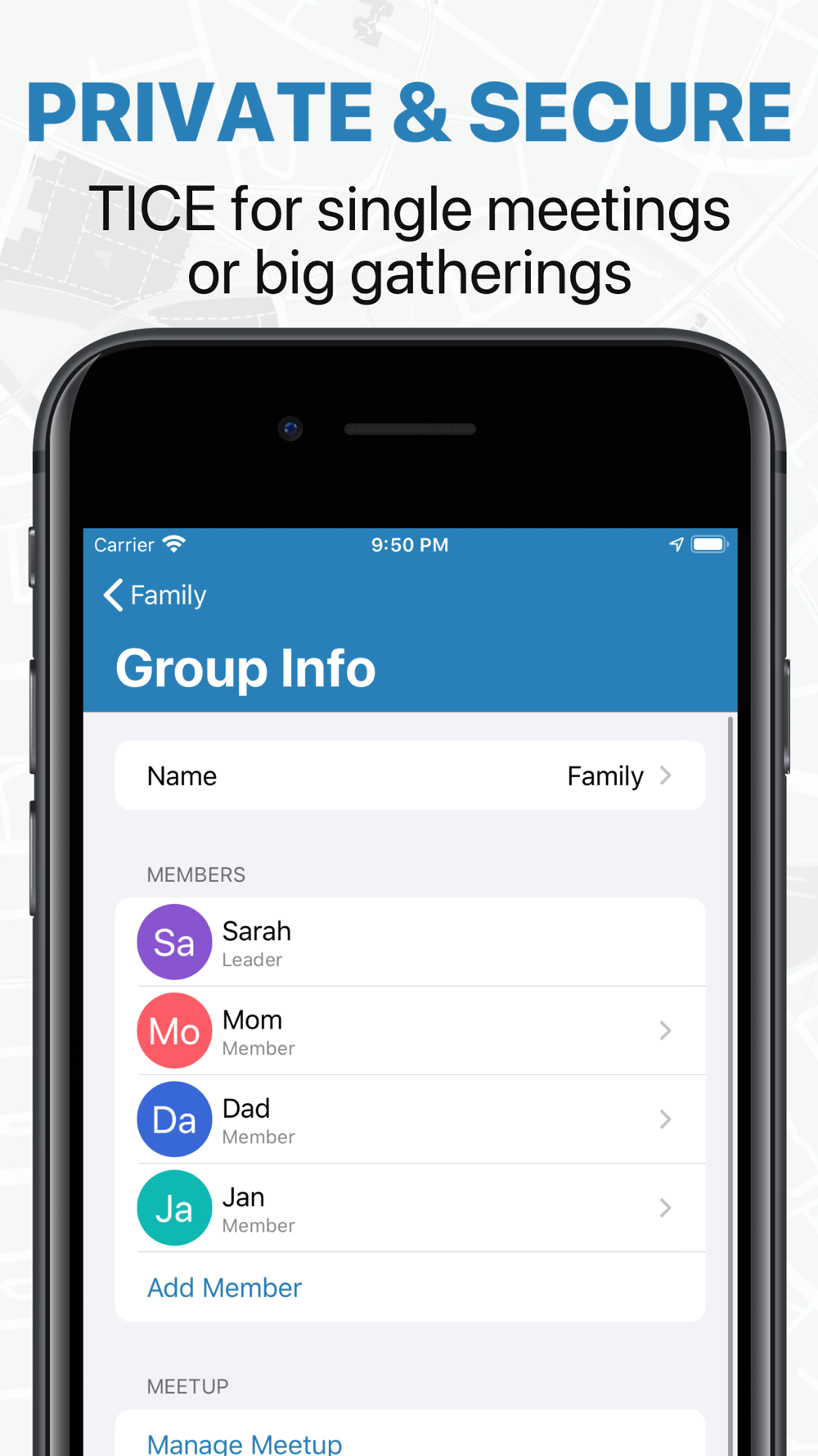 TICE is universal. Use it for private meetings with your family, locate friends, or coordinate your companies staff.