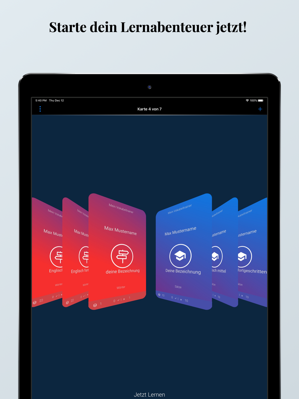 Ein kurzes Intro zeigt dir in 2 Minuten, wie der Lernbildschirm aufgebaut und dessen Handhabung ist. Und schon bist du lernbereit. Mehr Vorbereitungszeit brauchst du nicht. Alles ist selbst erklärend aufgebaut. Die App herunterladen und los geht es.