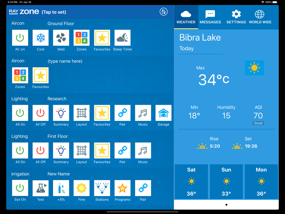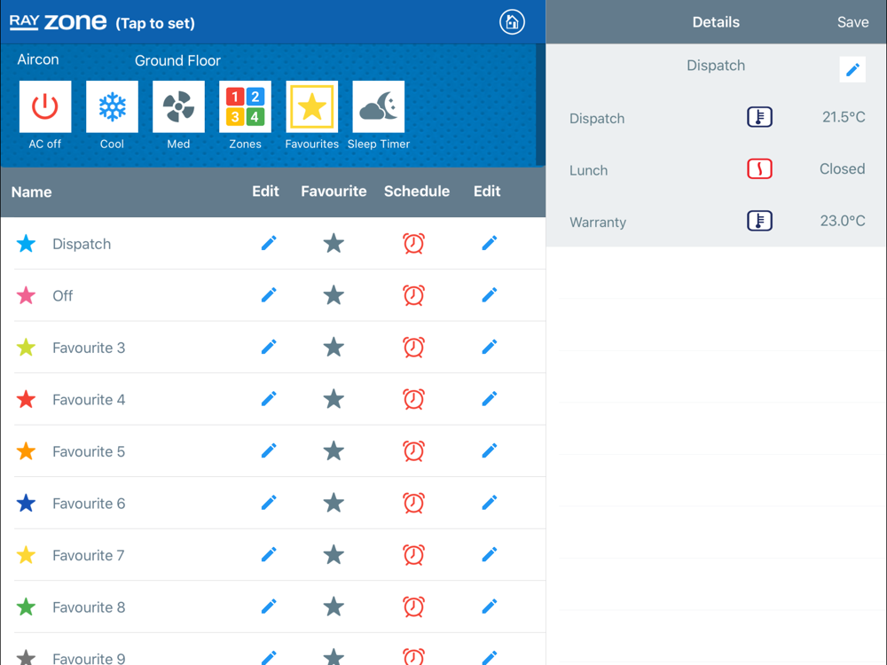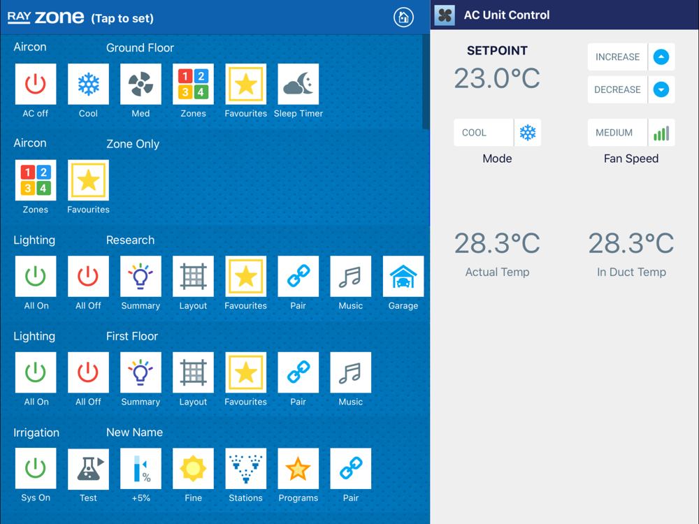The RayZone App is the perfect way to control your Aircon on your iPhone and iPad. You can manage your whole system from this app including your Aircon, lighting, irrigation, garage door, blinds and 240 Volt appliances. RayZone is an inexpensive plug & play home automation system that gives you total control of the following services:
