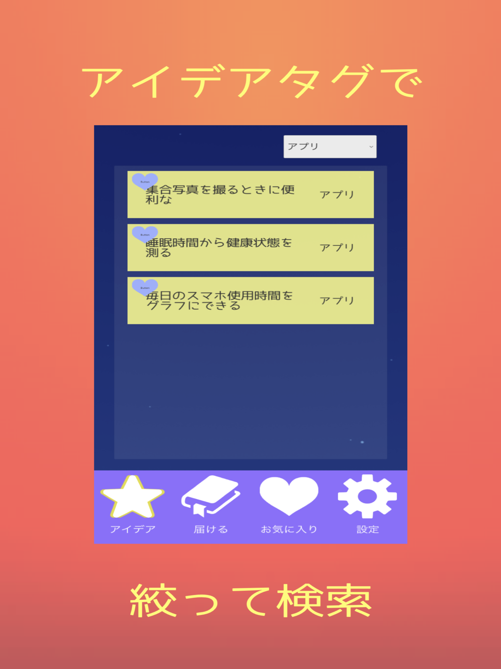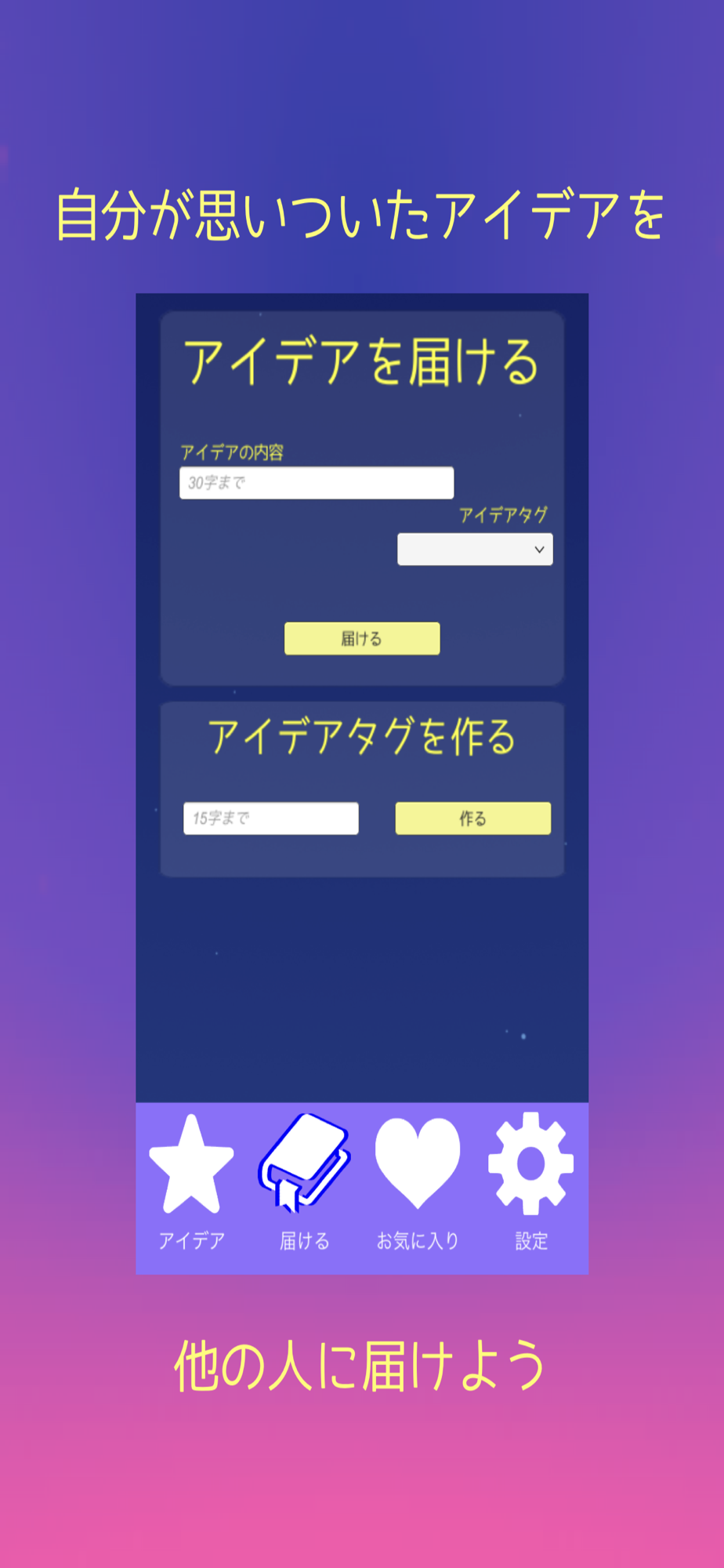 このアプリはアイデアに行き詰まった人とユニークなアイデアを思いついたけど実現できないから誰かに実現してほしい人を繋ぐアプリです。