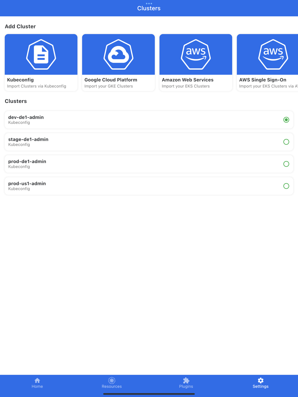- Manage multiple Clusters: Add multiple clusters via `kubeconfig` or your preferred Cloud Provider, including Google, AWS and Azure.