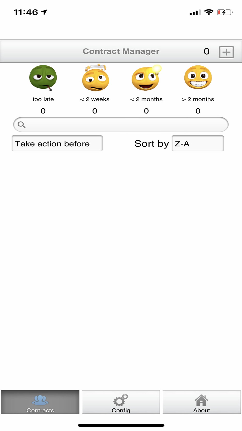 All created contracts are visible in the main screen, the end date, alert date and smiley emoji indicate the status of the agreement. The Ghost Contract App automatically generates a default alert (end date minus notice period minus 30 days). In addition to this you can also create additional alerts related to a specific date. The badge (red circle next to the Ghost Contract App icon on your device) shows the number of agreements (status “ended” excluded) which are due or will be due in 14 days (end date minus notice period). Please follow the tutorial to see how this is done.