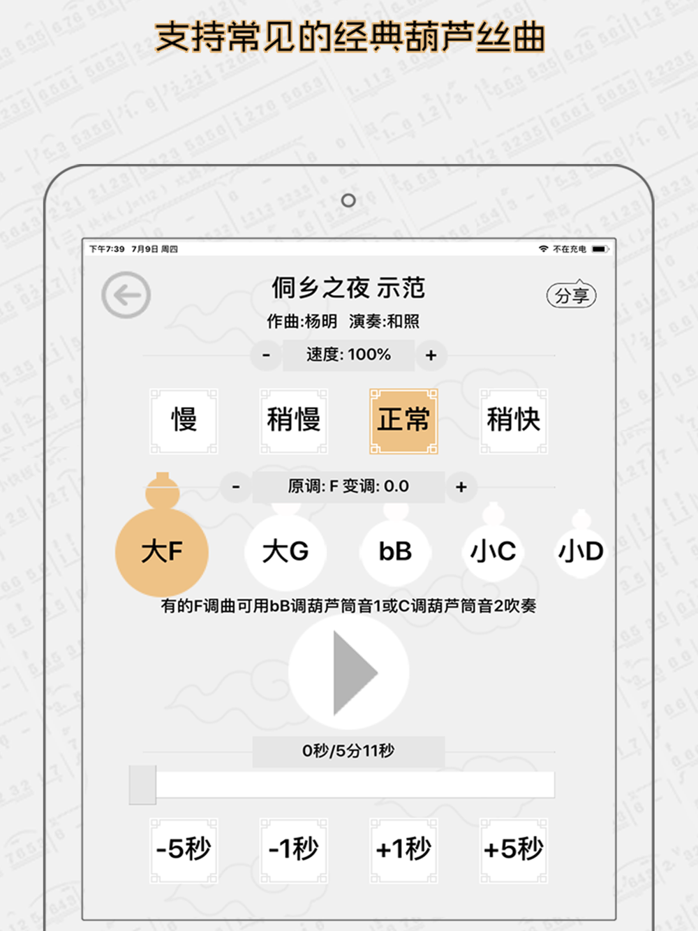 **注意** 该功能需要开启麦克风权限,因为要对葫芦丝进行录音分析频率。