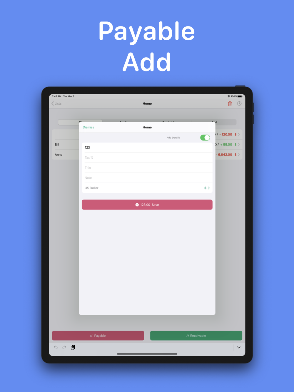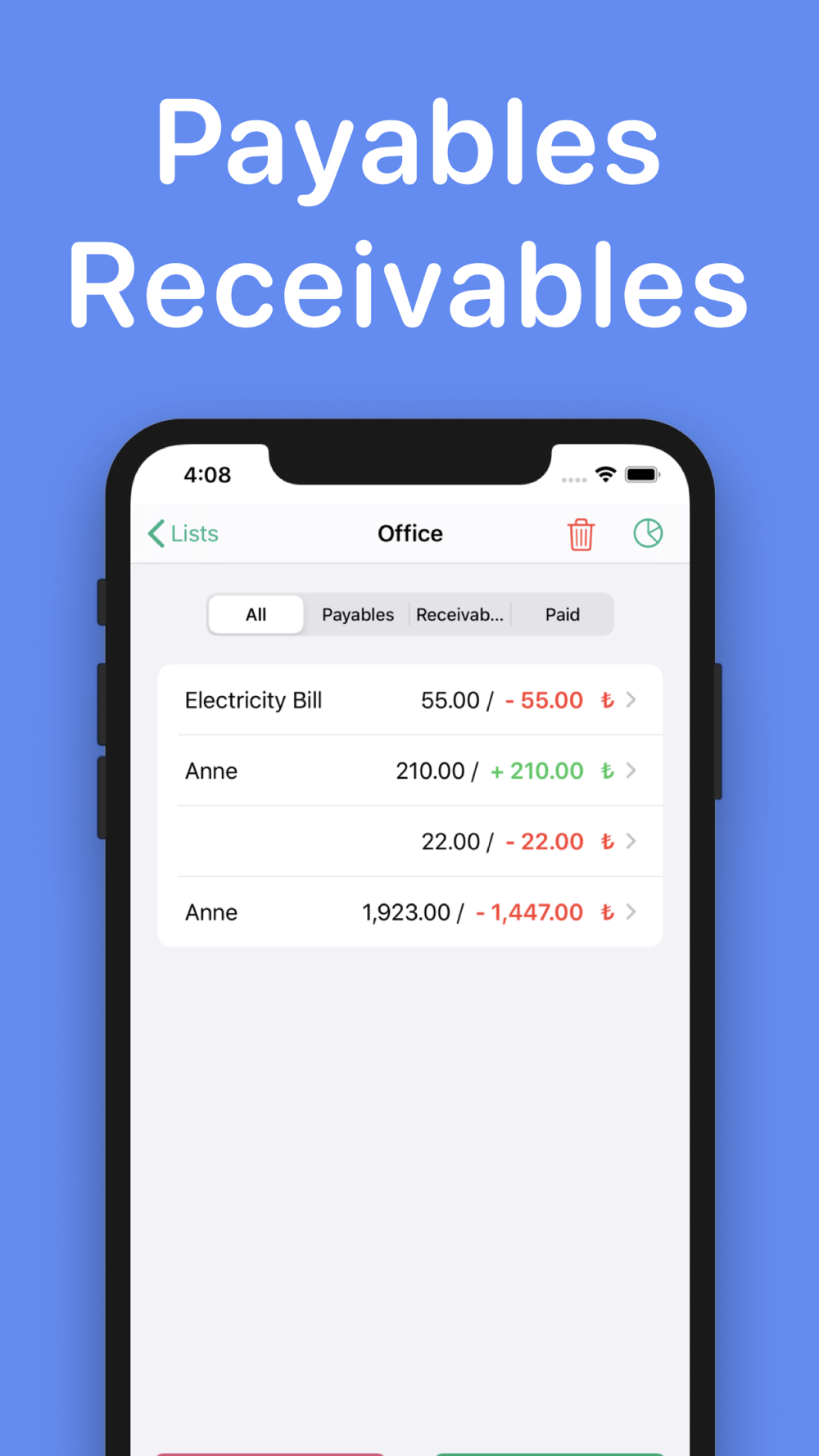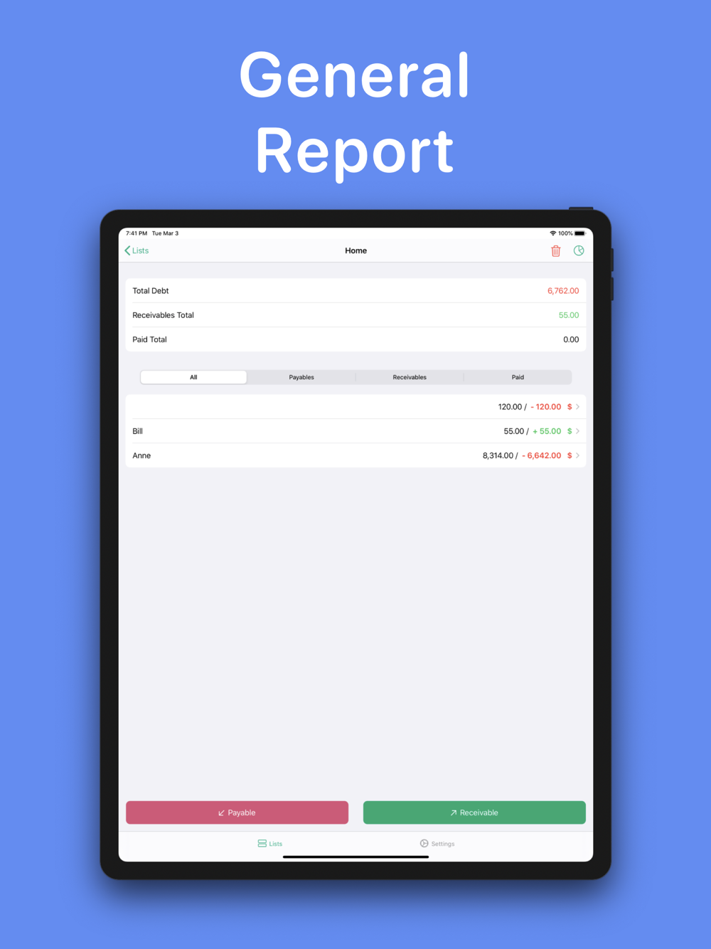 It is a great ‘lists app’ designed for individuals and businesses to follow/keep track of receivables and payables.