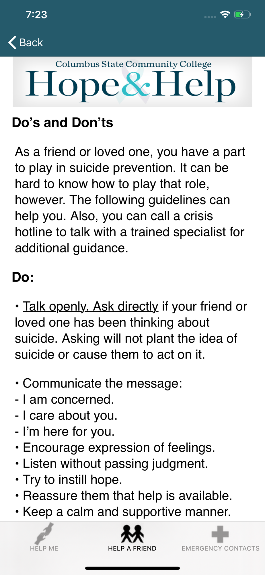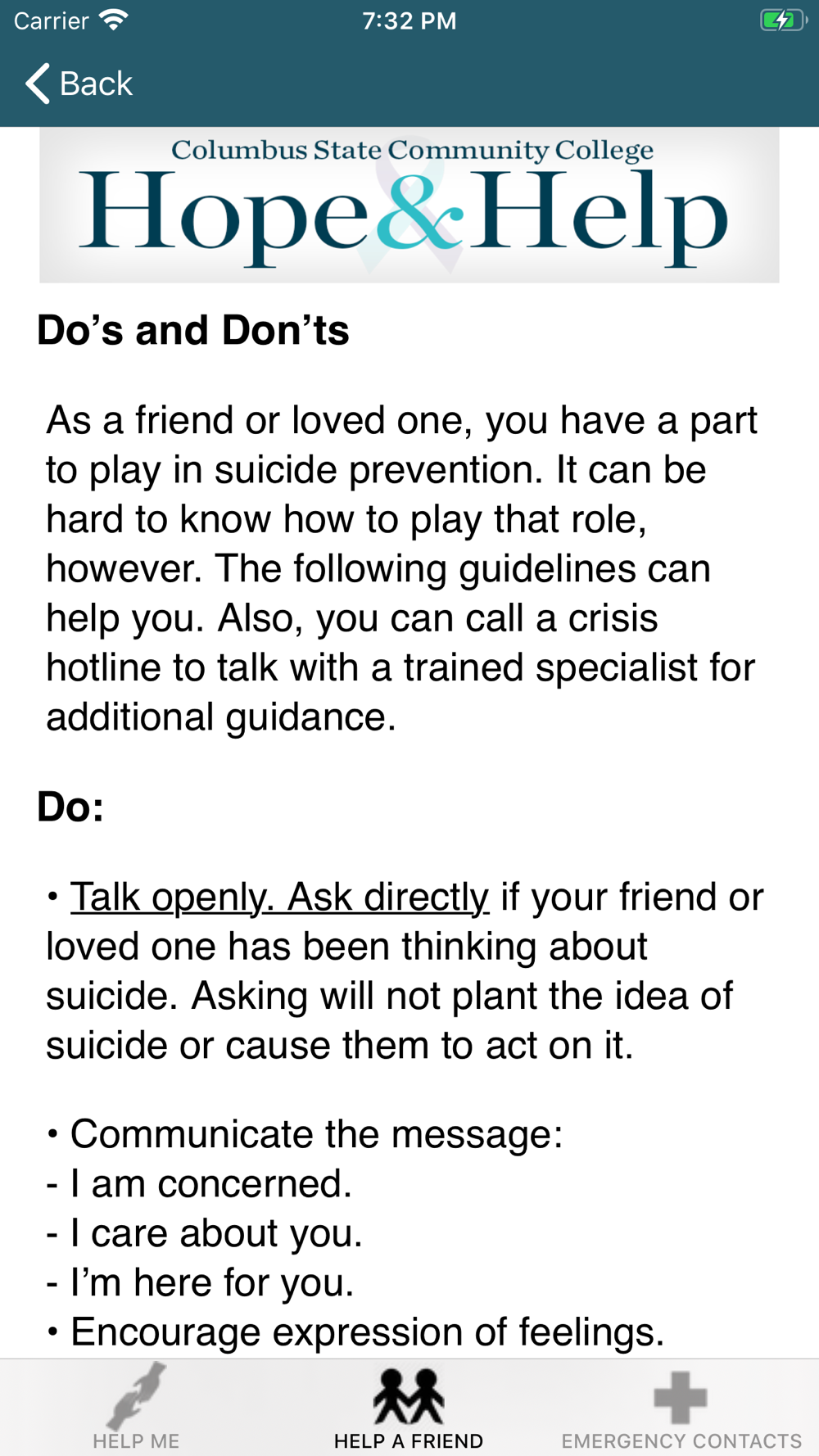 Columbus State Community College's Hope & Help app provides guidance for supporting a friend in need, suicide prevention, or coping with mental health challenges. With the “My Support Network” function, users can create a customized collection of just those contacts they especially want to quickly access and reach out to by phone or text during difficult times. Hope & Help also provides easy and centralized access to potentially life-saving resources and services offered on campus and in the community, including crisis hotlines. The Hope & Help app is designed for students, parents, friends of students, faculty and staff of Columbus State Community College, located in Columbus, Ohio. The Hope & Help app better prepares people to help a friend, loved one or themselves.