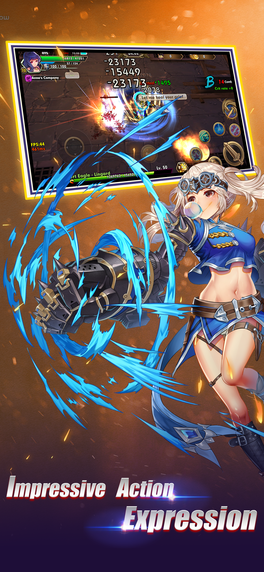 Play with your friend to start a Battle. A Battle could be a combat against to a Boss to collect rich gears, or a fight as the competitors to win the glory on the Arena. Have fun, have victory!