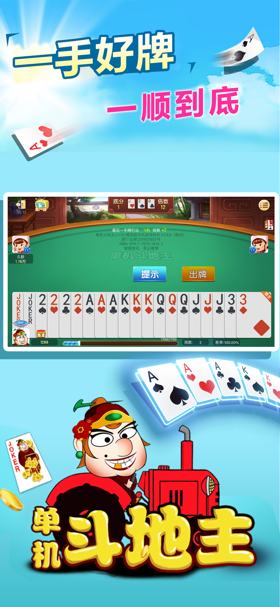 单机玩法,无需流量!还原经典玩法,智能AI电脑,不用担心对手不强,给你全新的挑战乐趣!打牌胜利后经验升级,解锁最高“帝皇”称号!