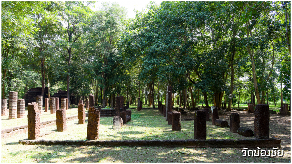 วัดฆ้องชัย ตั้งอยู่ทางด้านหน้าหรือด้านตะวันออกของวัดพระสี่อิริยาบถ กลุ่มโบราณสถานภายในวัดวางแนวตามแกนตะวันออก-ตะวันตก วิหารตั้งอยู่ด้านหน้าวัดปัจจุบันเหลือเฉพาะฐานอาคาร ลักษณะเด่นของฐานวิหาร วัดฆ้องชัยคือการก่อฐานสูง ฐานล่างทำเป็นฐานหน้ากระดานแต่มีการยืดจนดูเหมือนเป็นผนัง เจดีย์ประธานตั้งอยู่ถัดจากฐานวิหารไปทางด้านหลัง เหลือเฉพาะส่วนฐานสี่เหลี่ยมและฐานแปดเหลี่ยม รูปทรงเดิมเป็นแบบเจดีย์ทรงระฆังฐานแปดเหลี่ยม นอกกำแพงวัดด้านทิศตะวันตกปรากฏบ่อตัดศิลาแลงขนาดใหญ่