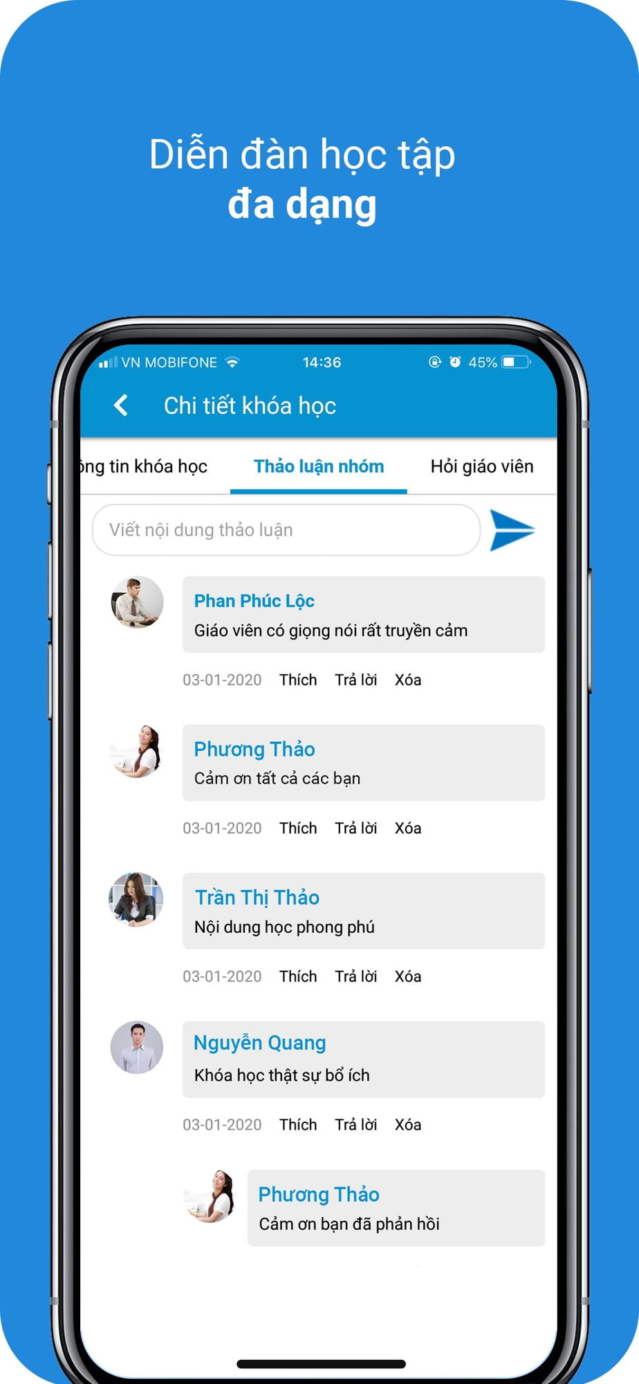 - Diễn đàn học tập: Học viên có thể thảo luận với các học viên khác cũng như gửi câu hỏi đến cho giáo viên giảng dạy ngay trên app.