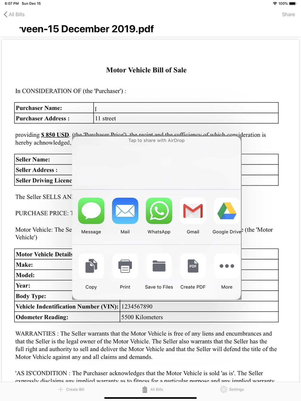 •The date at the top auto-fills on the date you are creating the bill of sale.